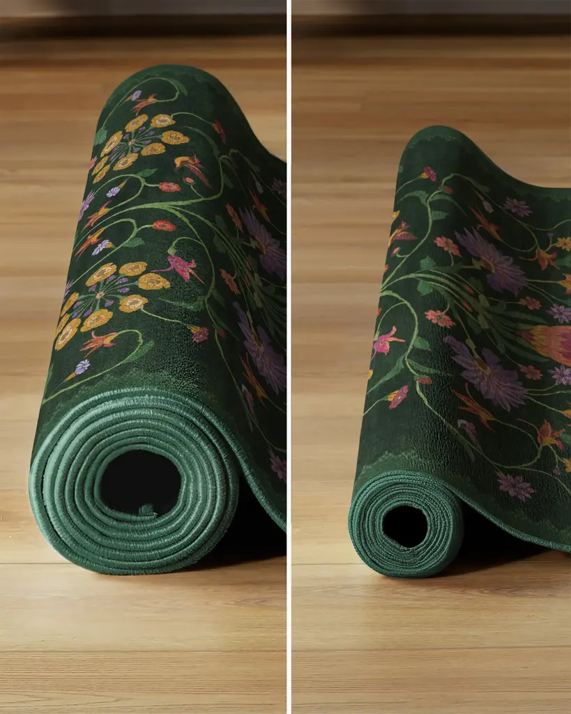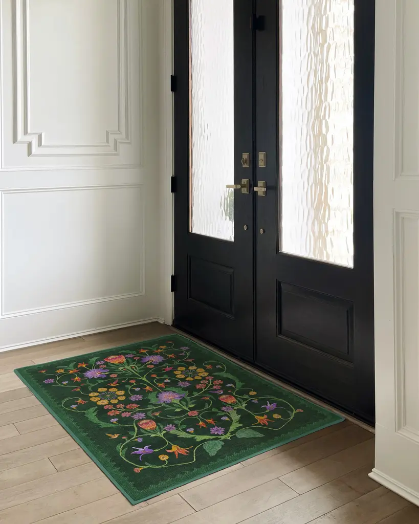 BACK BY POPULAR DEMAND: Celebrate a lasting legacy with our Limited Edition Iris Apfel Protea Forest Green Rug. Inspired by floral fabrics from Iris' own collection, this botanical design features vivid, mirrored floral motifs that attract the sweetest hummingbirds in a garden-like setting. Petals in bright yellow, lavender, pink, and red bloom beautifully against a deep green background. Water-resistant, stain-resistant, and machine-washable. Rug colors may vary slightly according to your device and the lighting in your space.