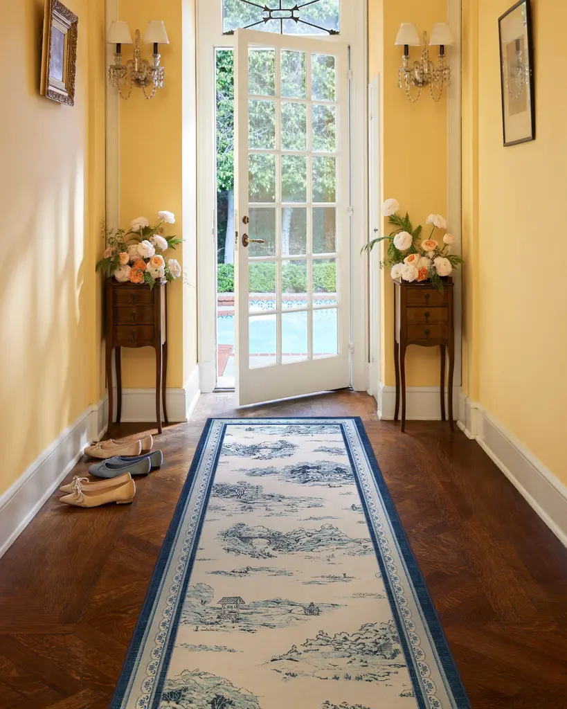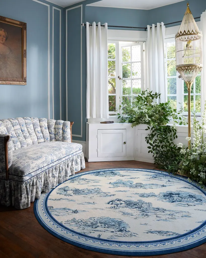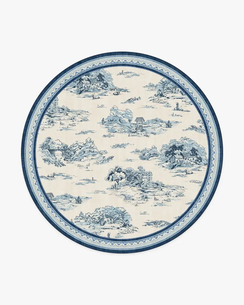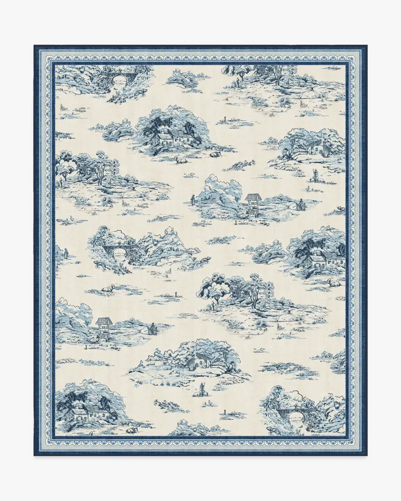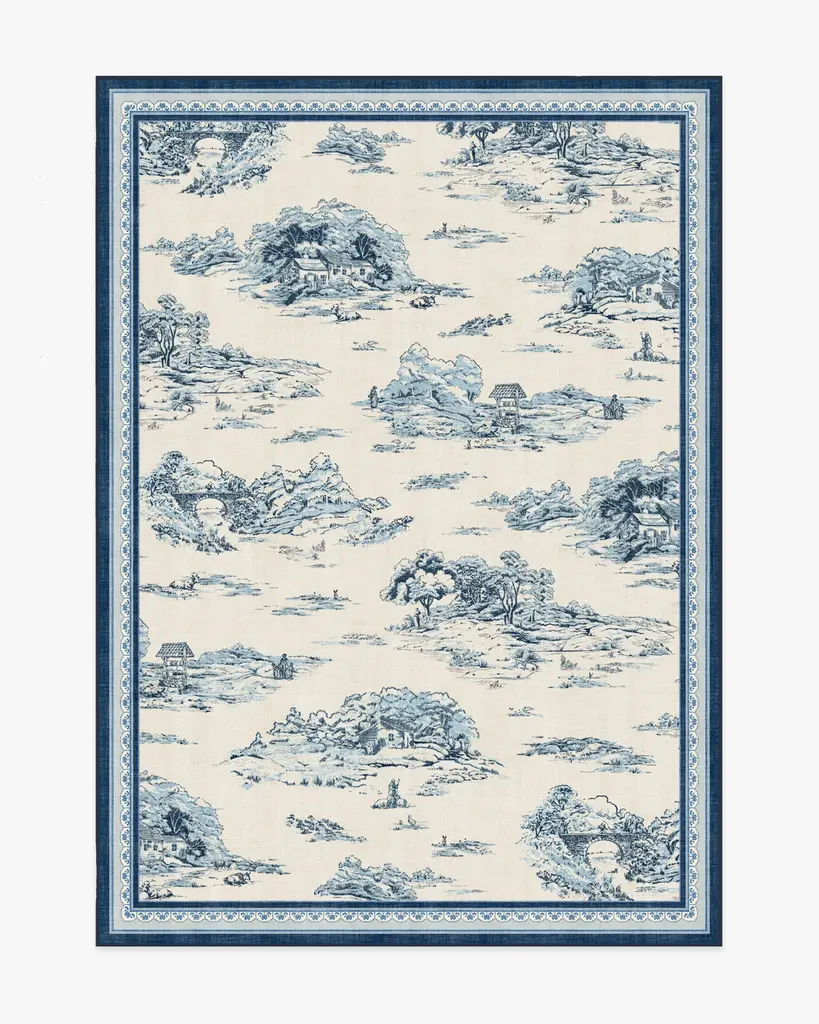 Live in lavish luxury with our Regency-era Provence Toile Delft Blue Rug. Inspired by idyllic and quaint scenes of the French countryside, this classic toile design captures the essence of flora and fauna in pastoral landscapes. The soothing Delft Blue motifs are seamlessly integrated across a cream background. Water-resistant, stain-resistant, and machine-washable. Rug colors may vary slightly according to your device and the lighting in your space.