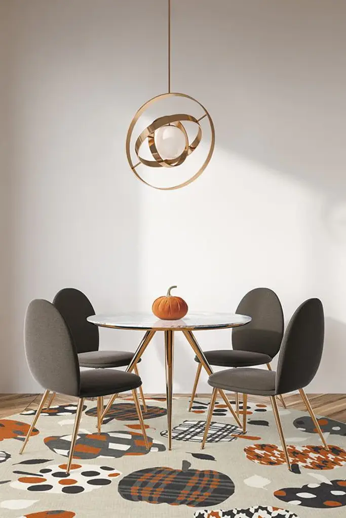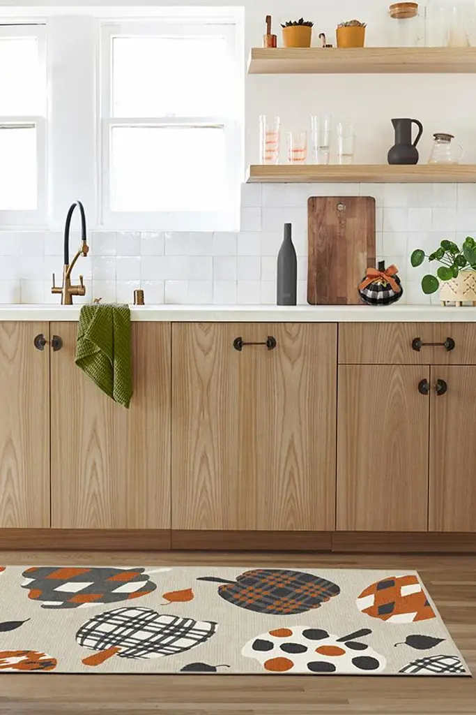 Our Pumpkin Orange Rug is all dressed up and ready to liven up your fall or Halloween decor. A harvest of patterned pumpkins, colored in autumn hues of orange and grey, makes this whimsical rug a seasonal must-have. Water-resistant, stain-resistant, and machine-washable.