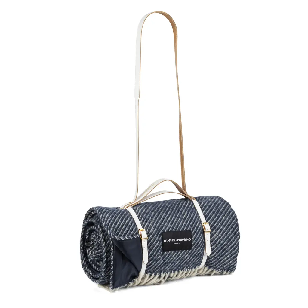 Diagonal dark blue pure new wool picnic rug with dark blue waterproof backing and handmade white leather strap. Made in Britain.Our luxury waterproof blankets will make your picnics comfy, dry and stylish! Each rug is large enough and ideal for several adults, but rolls up into an easy-to-carry bundle with a slim elegant strap that can hook onto your backpack or bike for a day out.