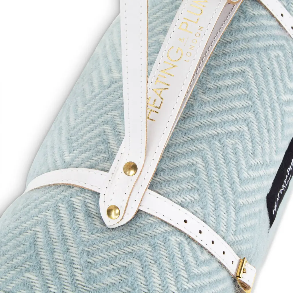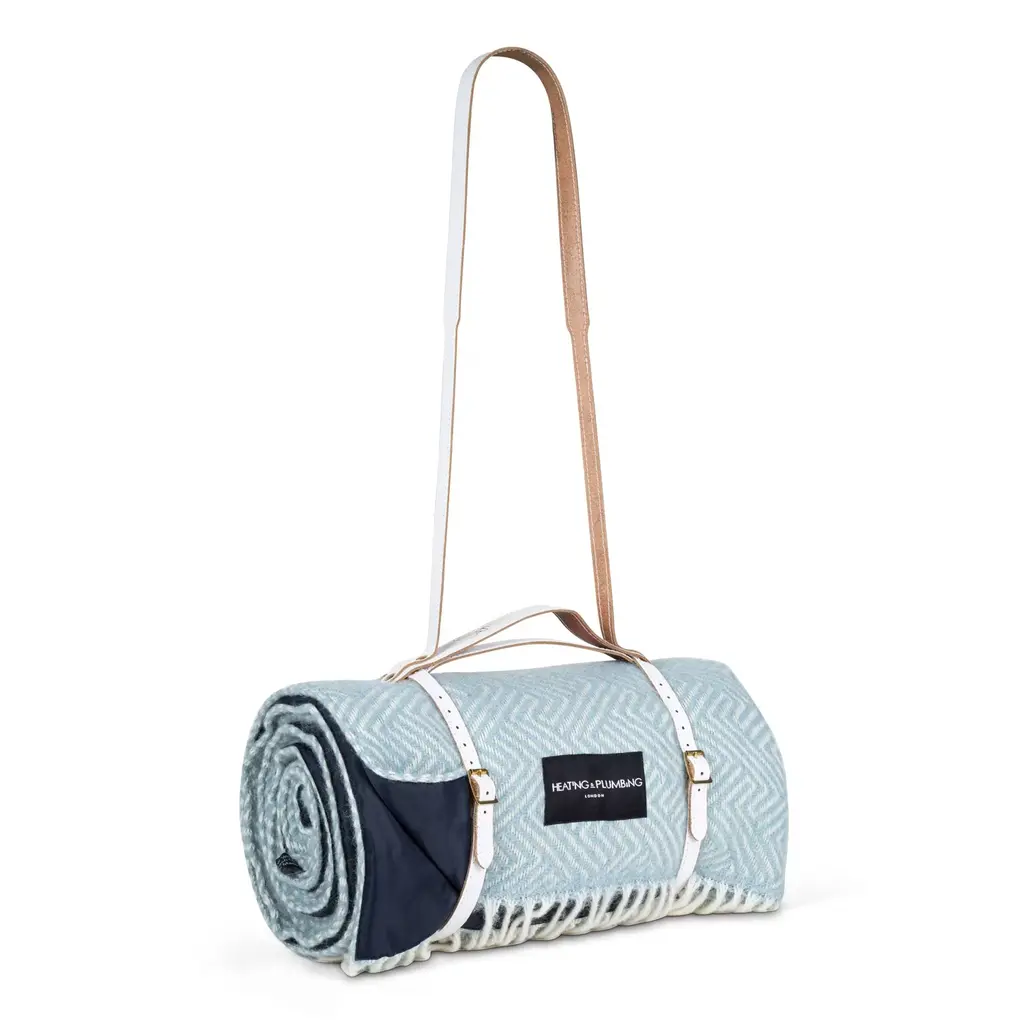 Lollypop Duck Egg pure new wool picnic rug with grey waterproof backing and handmade white leather shoulder strap.The combination of soft pure new wool on the top and strong durable polyester backing means that you can be out in the open no matter what the weather as the water-resistant backing will keep you dry and comfy.This large blanket rolls up into an easy-to-carry compact bundle with an elegant leather strap that can easily hook onto your backpack, or bike for a day in the park, at the beach or in the country, for music concerts, festivals or simply in your back garden!