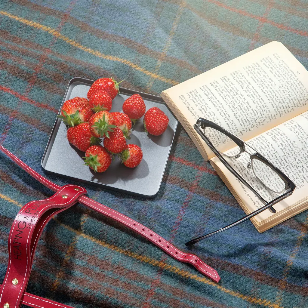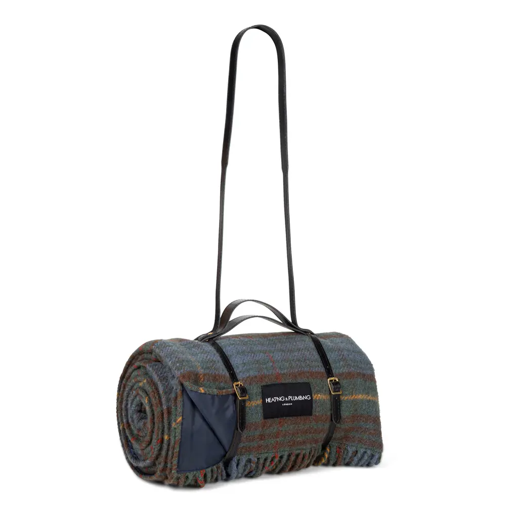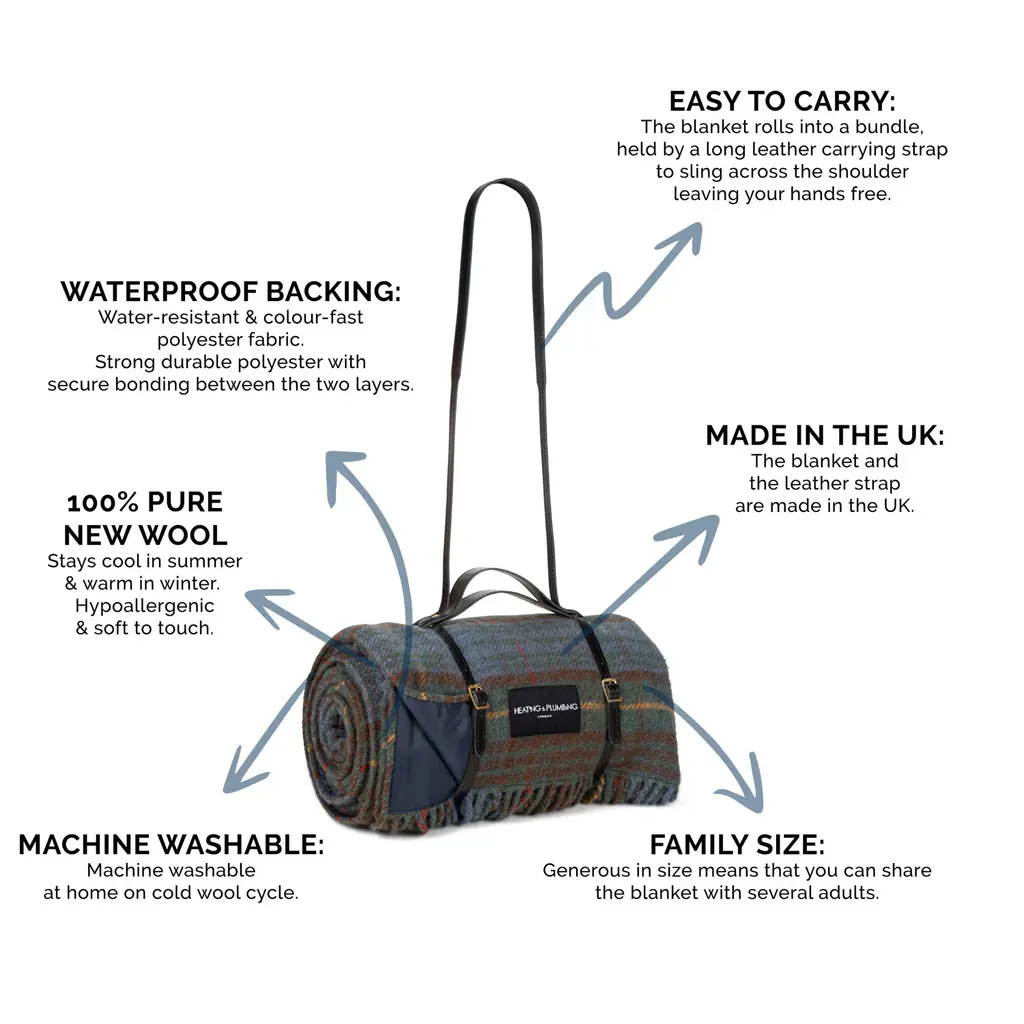 Classic hunting lodge pure new wool picnic rug with navy blue waterproof backing black leather shoulder strap.The combination of soft pure new wool on the top and strong durable polyester backing means that you can be out in the open no matter what the weather as the water-resistant backing will keep you dry and comfy.This large blanket rolls up into an easy-to-carry compact bundle with an elegant leather strap that can easily hook onto your backpack, or bike for a day in the park, at the beach or in the country, for music concerts, festivals or simply in your back garden!