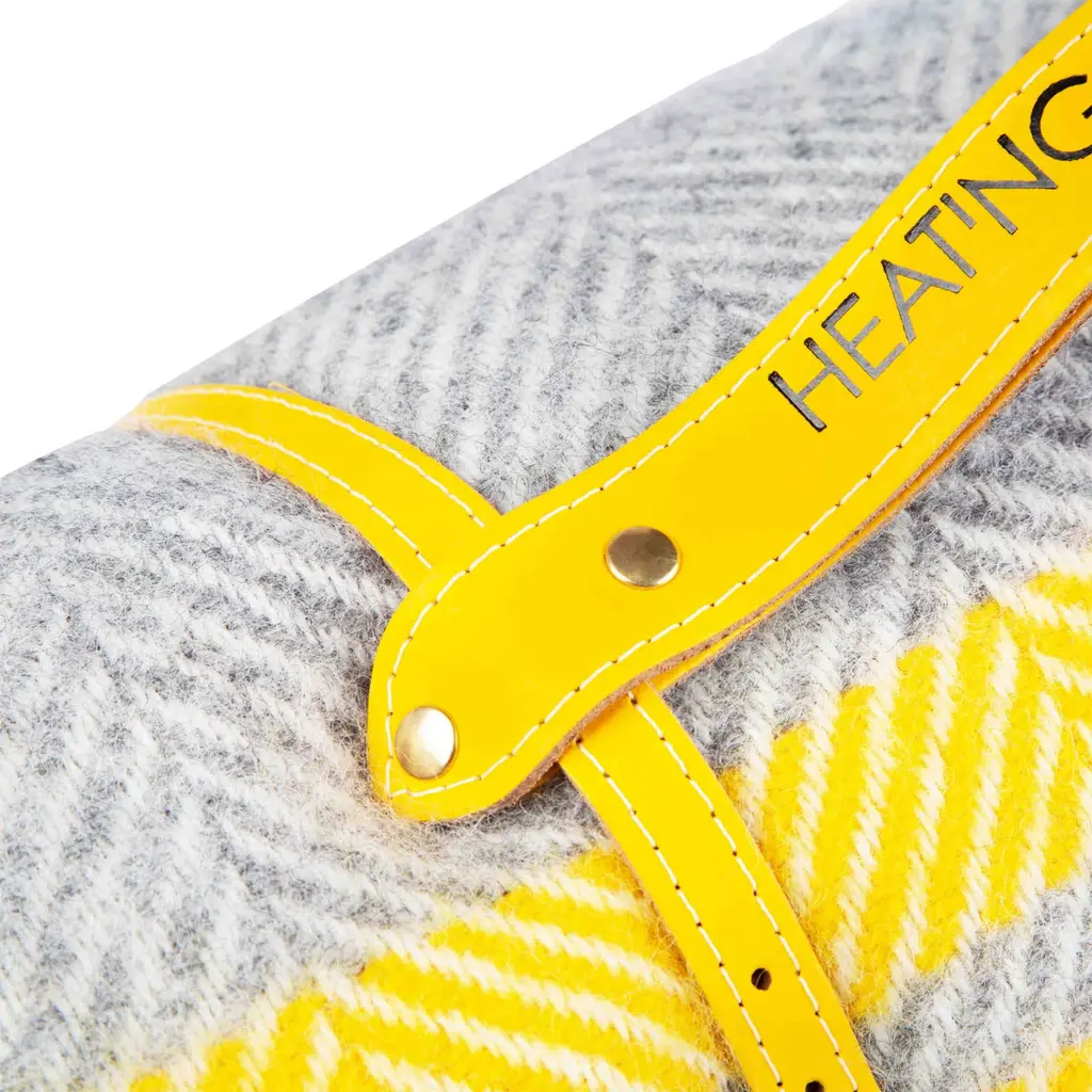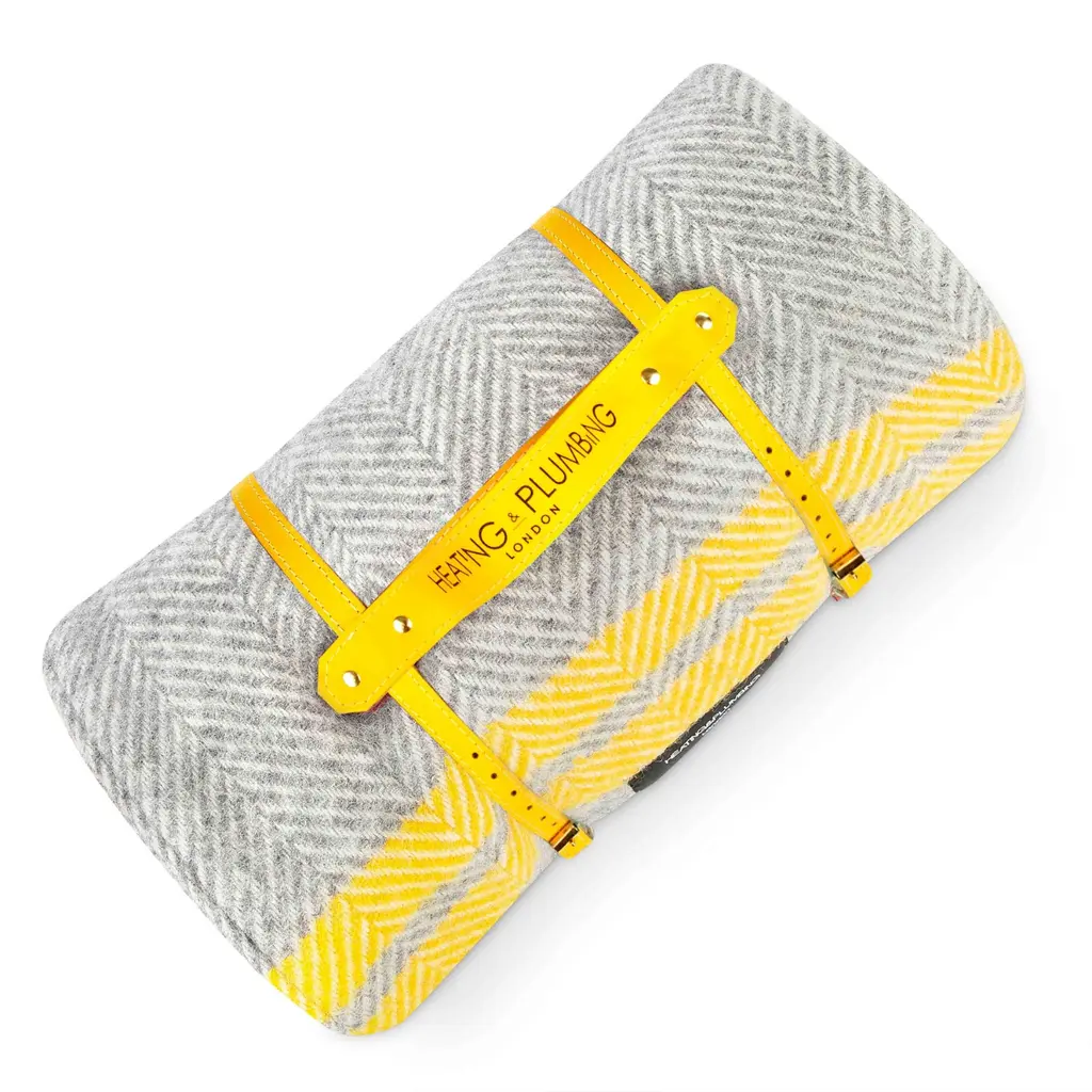 Grey & Yellow pure new wool picnic rug with yellow waterproof backing and handmade leather yellow strap.The combination of soft pure new wool on the top and strong durable polyester backing means that you can be out in the open no matter what the weather as the water-resistant backing will keep you dry and comfy.This large blanket rolls up into an easy-to-carry compact bundle with an elegant leather strap that can easily hook onto your backpack, or bike for a day in the park, at the beach or in the country, for music concerts, festivals or simply in your back garden!