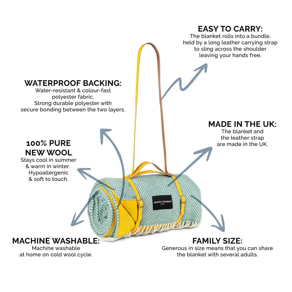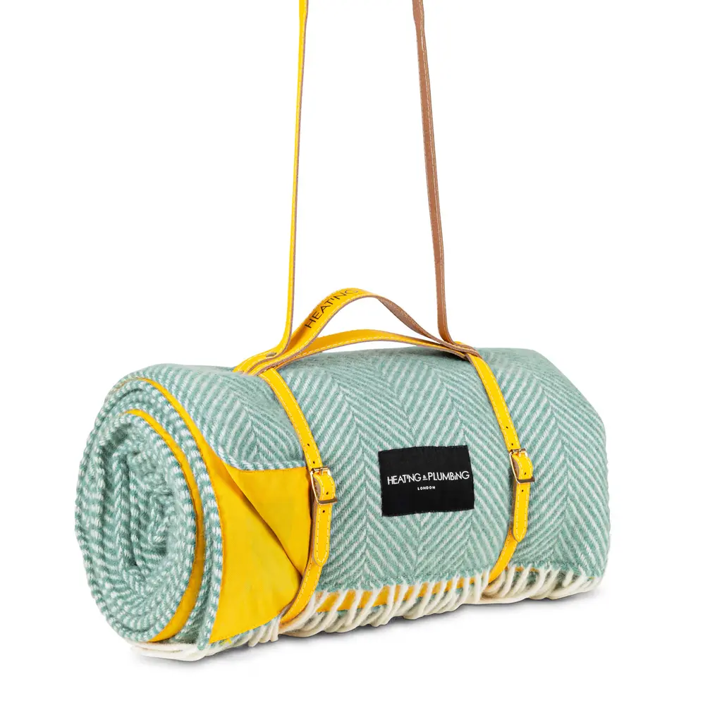 Mint green pure new wool picnic rug with sunshine yellow waterproof backing and handmade yellow shoulder strap.Our luxury waterproof picnic blankets will make your picnics comfy, dry and stylish! Each rug is large enough and ideal for several adults, but rolls up into an easy-to-carry bundle with a slim elegant strap that can hook onto your backpack or bike for a day out.Truly designed for the unpredictable British weather, with a soft top layer of pure new wool lined with durable waterproof backing, these rugs are gloriously comfortable to sit on.