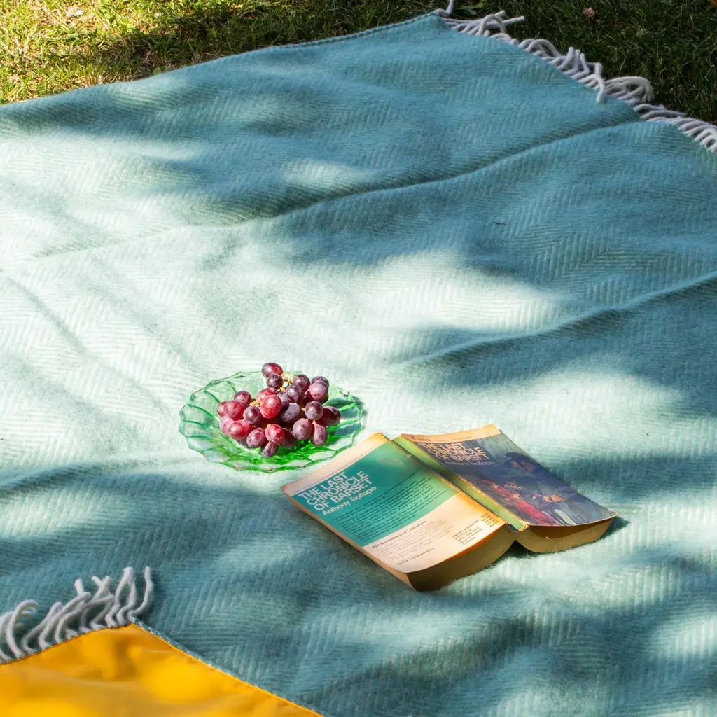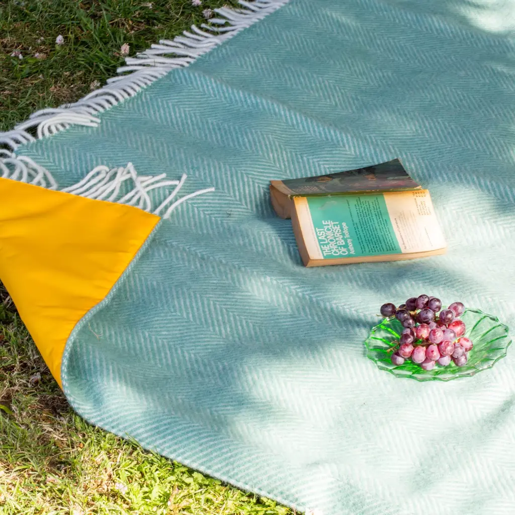 Pure New Wool Waterproof Picnic Blanket Mint Green & Yellow