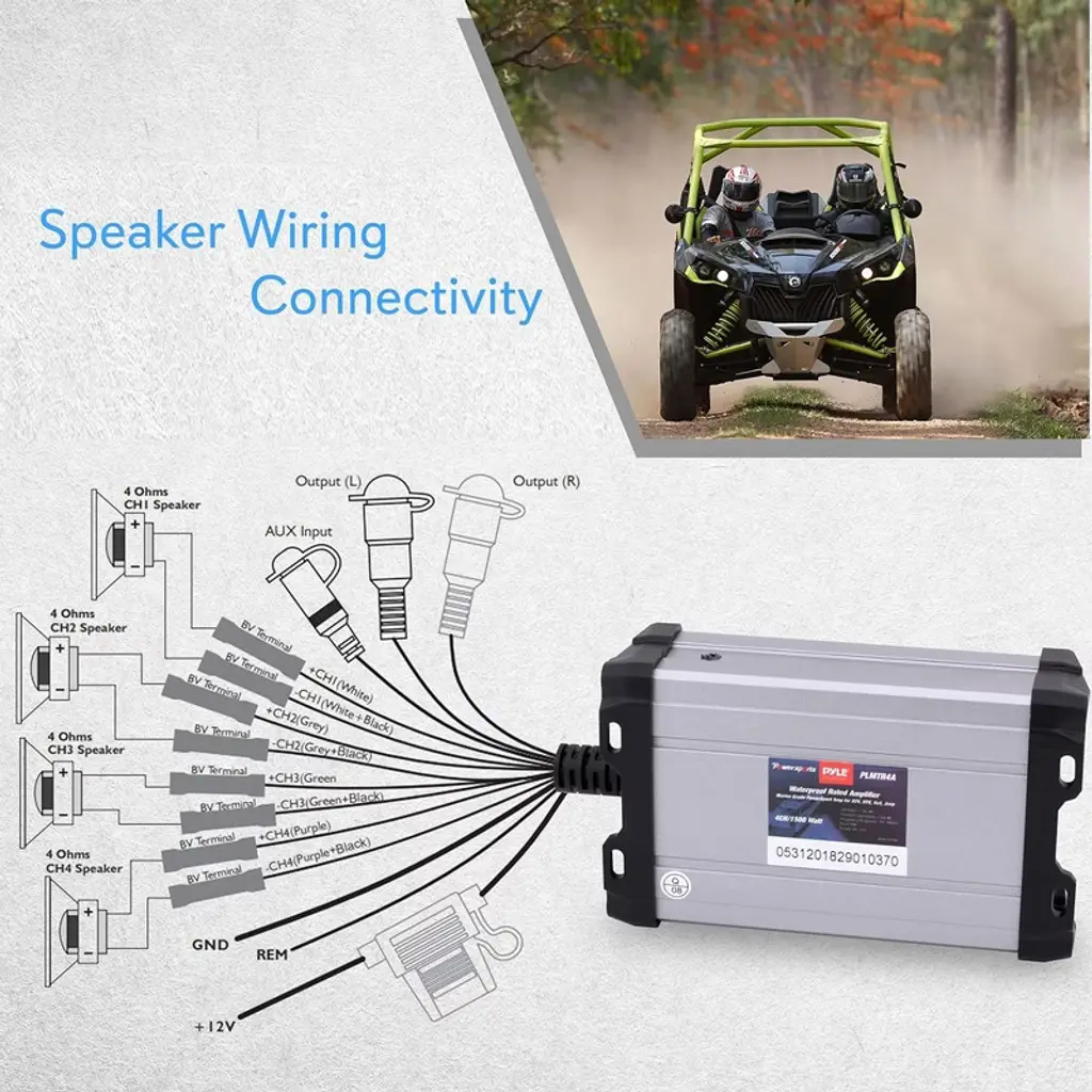 Enhance your marine audio experience with the Pyle 4-Channel Waterproof Rated Marine Amplifier (PLMTR4A). Designed for rugged outdoor environments, this amplifier boasts a 1200 Watt MAX power output and is perfect for ATVs, UTVs, 4x4s, Jeeps, and marine watercraft. The IP-65 waterproof rating ensures durability against water and weather, while the weather-resistant connectors and integrated power wiring harness provide secure and reliable connections. With the ability to connect and stream audio from external devices via a wired mini 3.5mm AUX input, this amplifier is versatile and easy to use. Additional features include anti-thump turn-on, soft turn on/off, and overload and power protection circuitry for added safety.