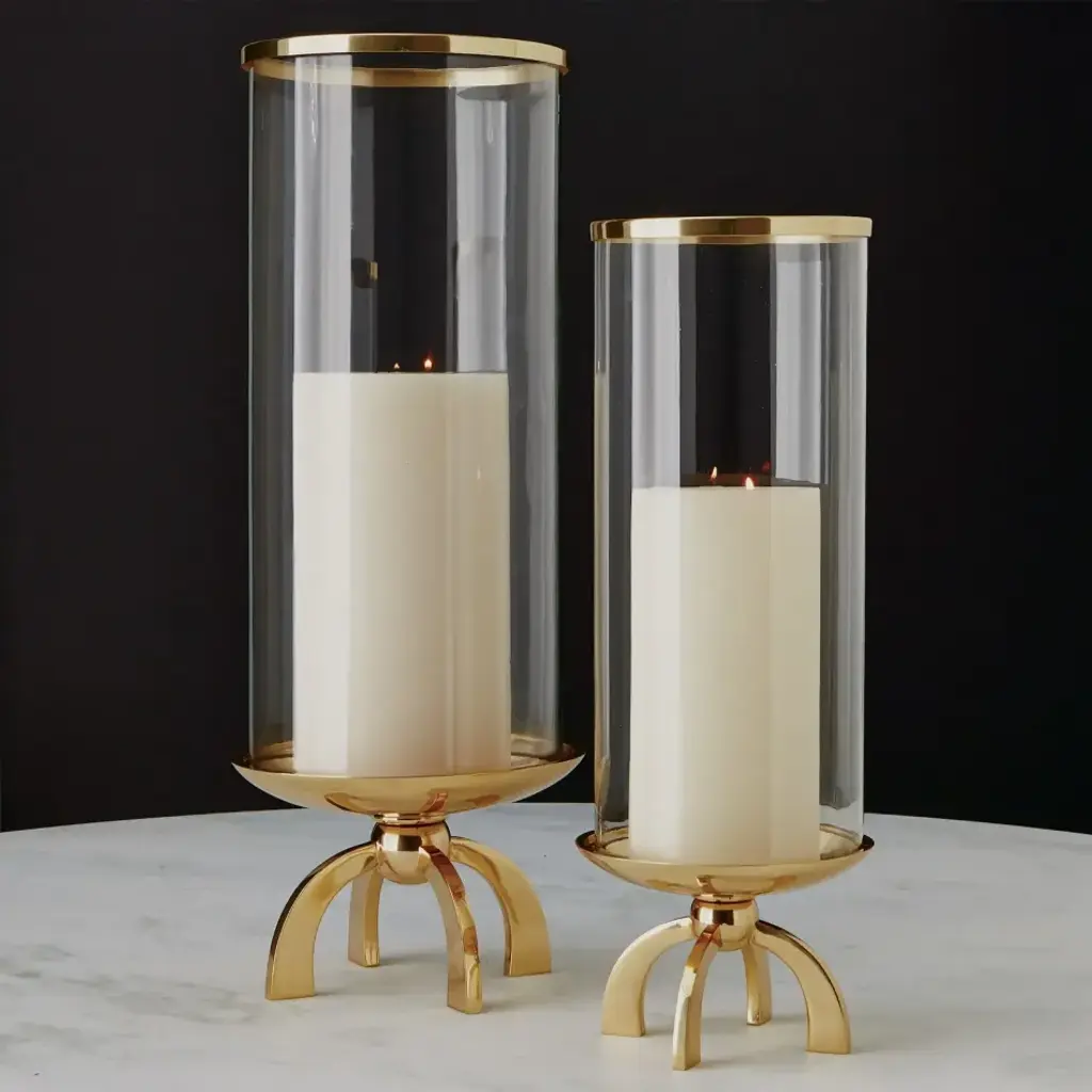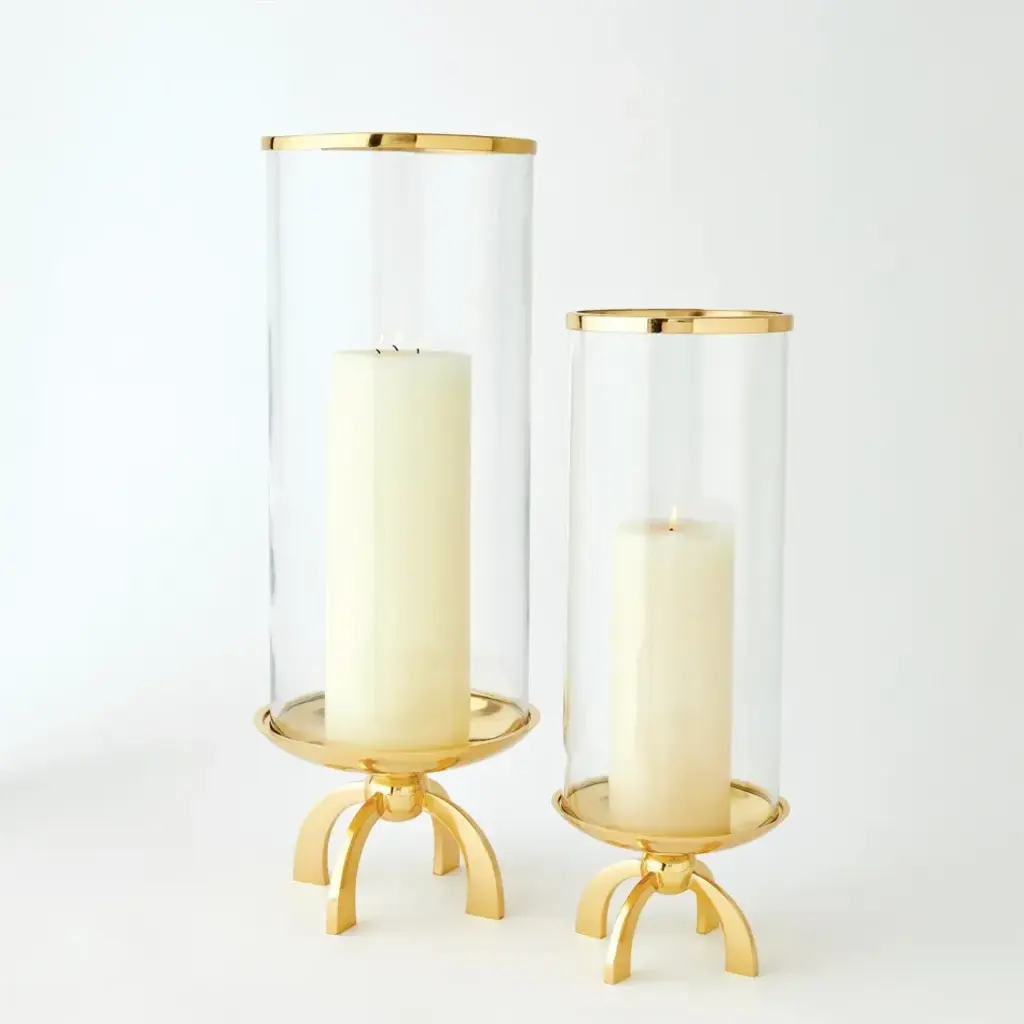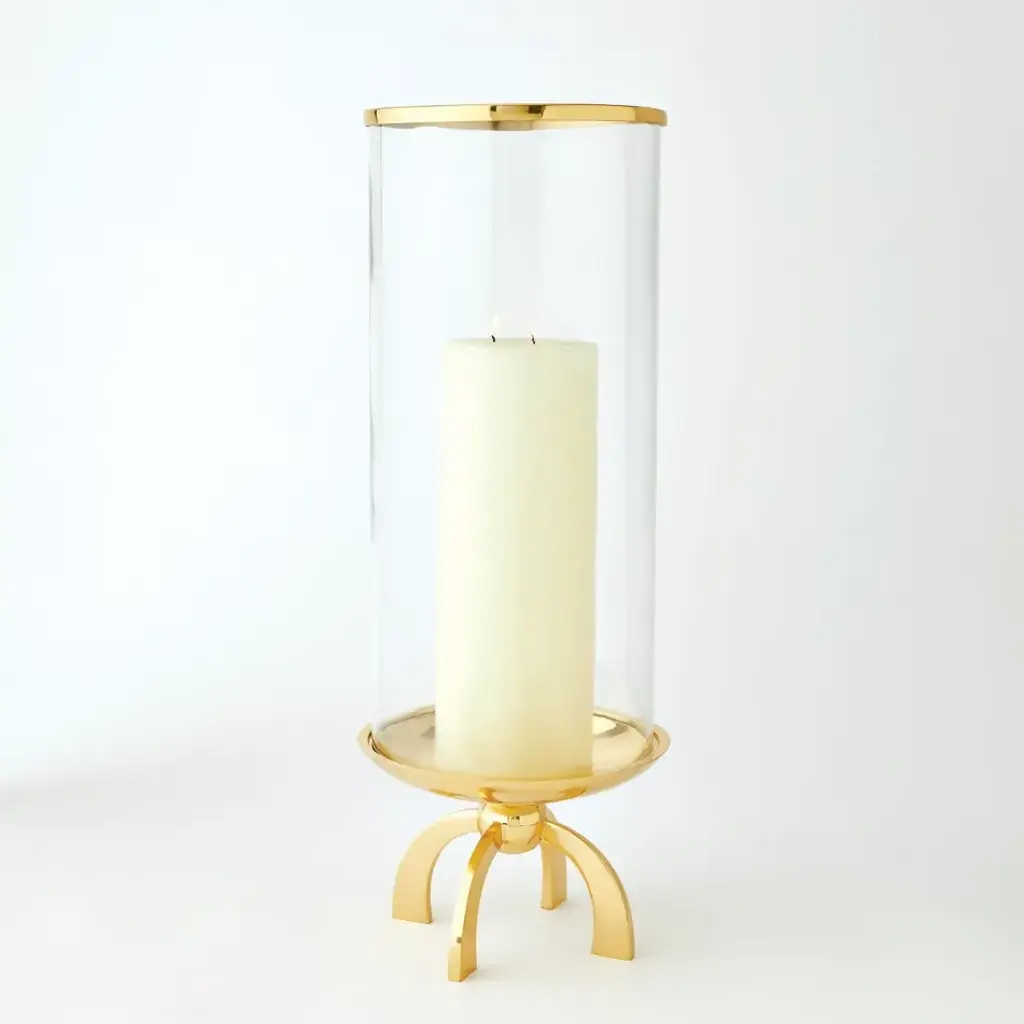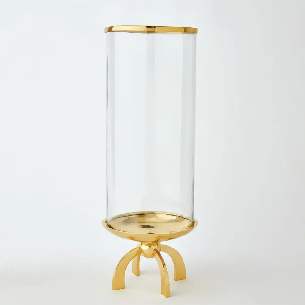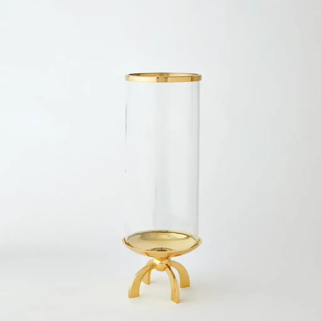 Quad Base hurricane made of cylindrical glass with a top band of shiny brass and a shallow brass finished dish. From a fashion forward perspective, Global Views offers accessories, furniture, statement lighting, and an assortment of rugs and mirrors to add beauty and joy to your home.
