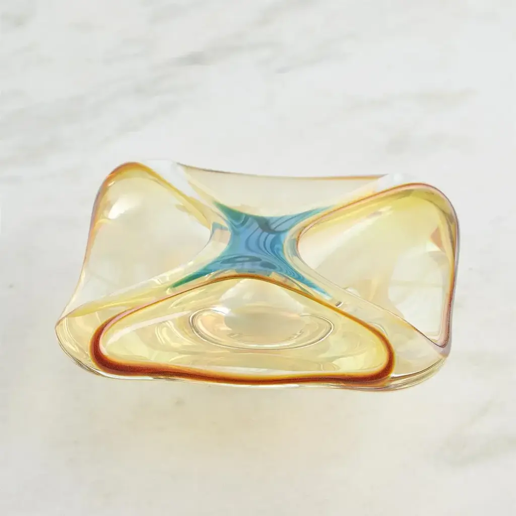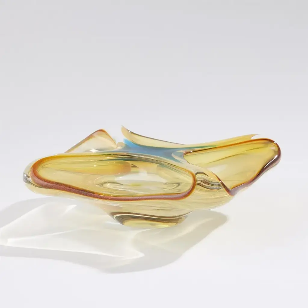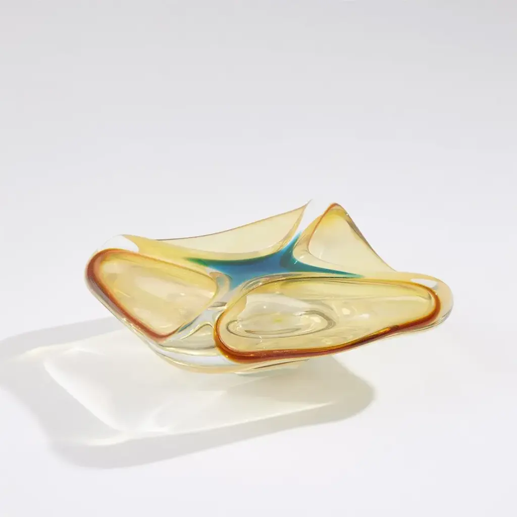 Featuring graceful curves and radiant edges, the Quattro Vessel is an optical feast. This exquisite Polish art glass bowl showcases soft beige and amber hues on the interior bottom, where they meet to highlight a stunning turquoise center. The captivating color interaction creates a one-of-a-kind work of art, making each piece truly unique. From a fashion forward perspective, Global Views offers accessories, furniture, statement lighting, and an assortment of rugs and mirrors to add beauty and joy to your home.