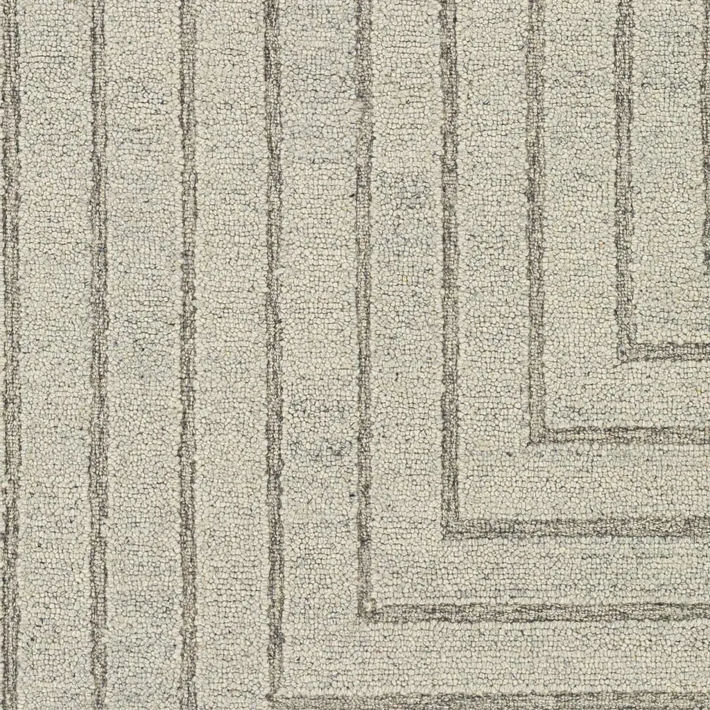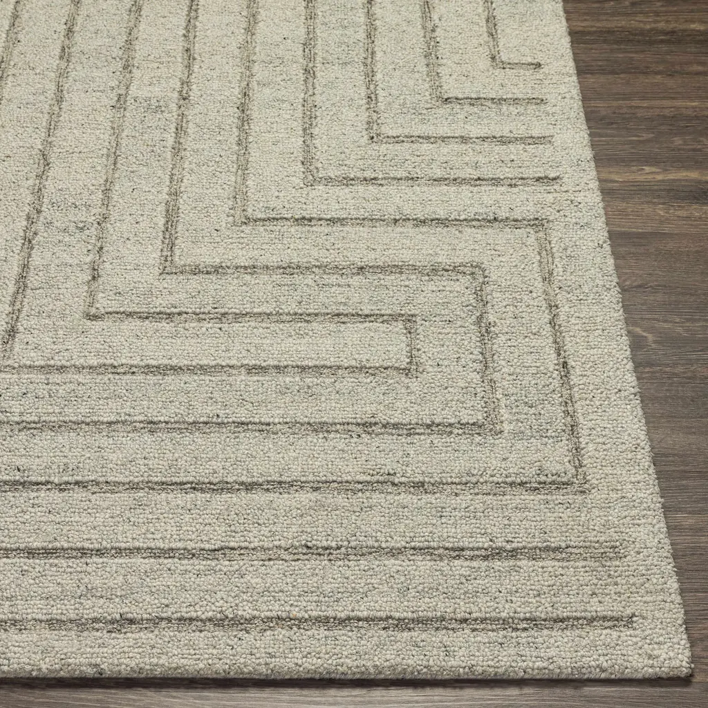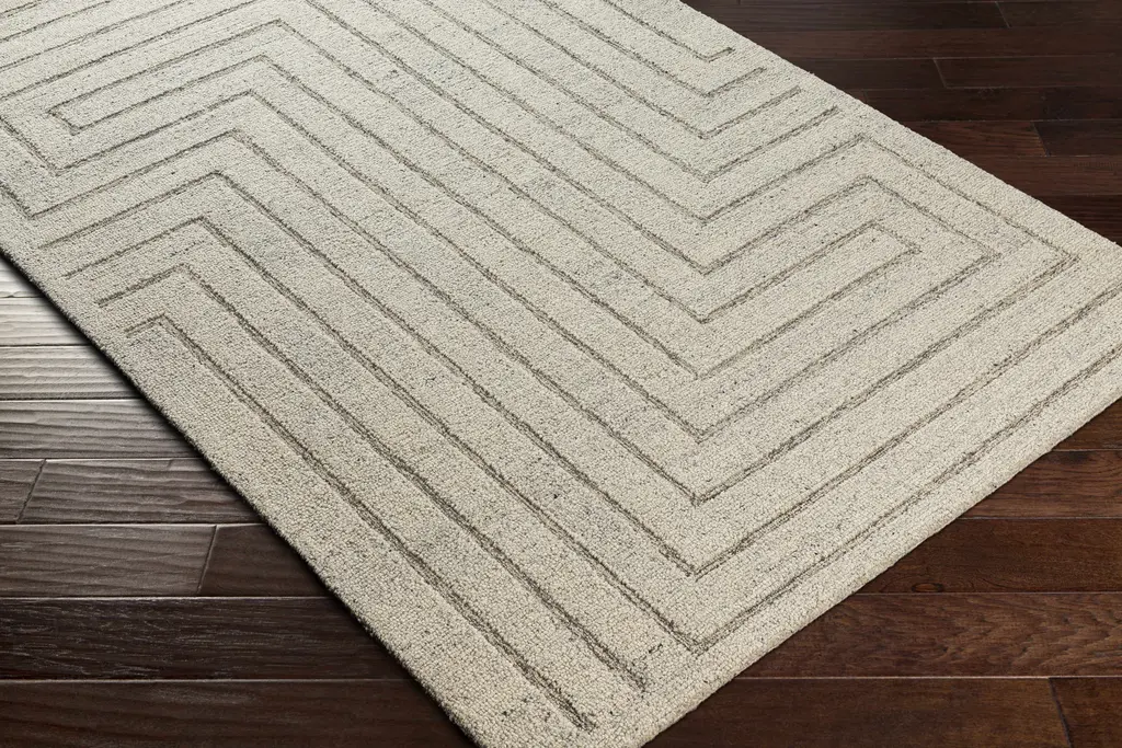 Collection: Queenton Colors: Charcoal, Light Gray Construction: Hand Tufted Material: 100% Wool Pile: Low Pile Pile Height: 0.2" Styles: Contemporary Made In: India Thickness: 0.39" Price Range: $$$$$ (Most Affordable)