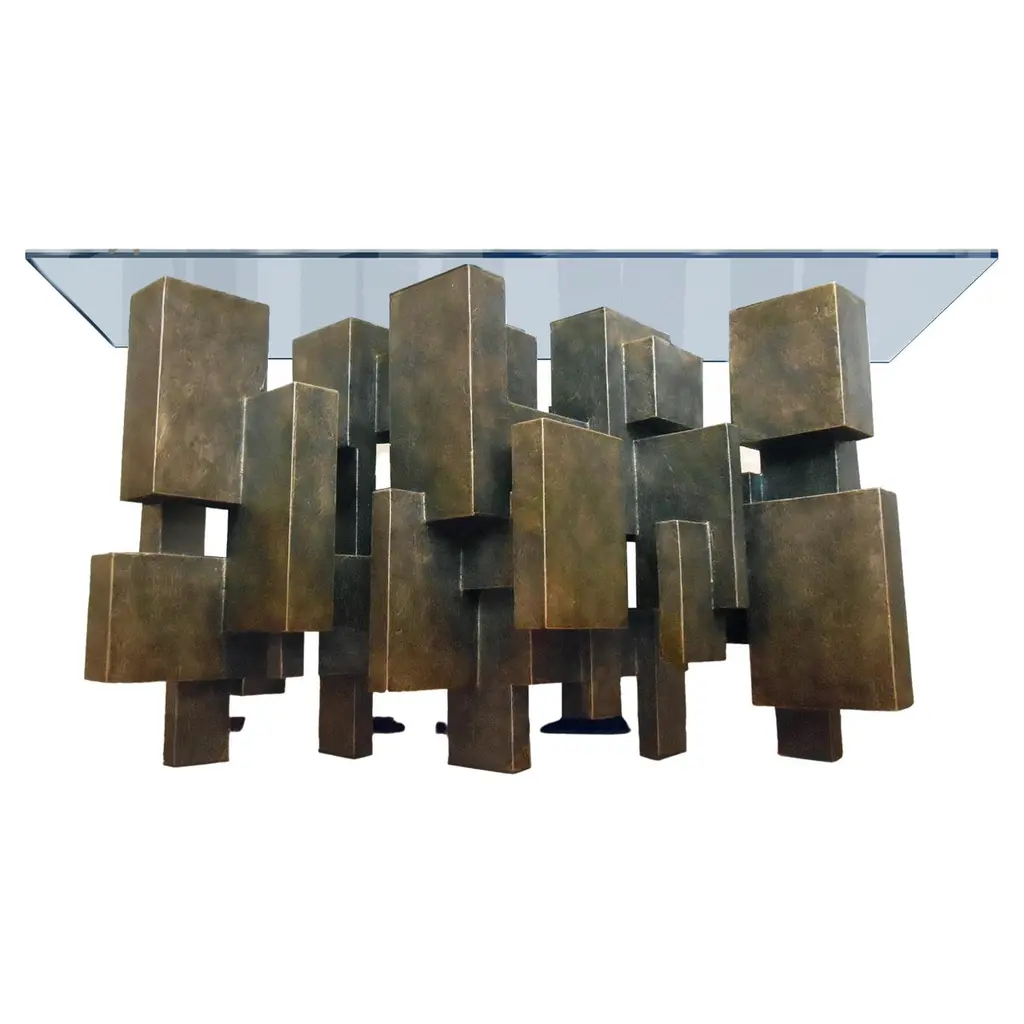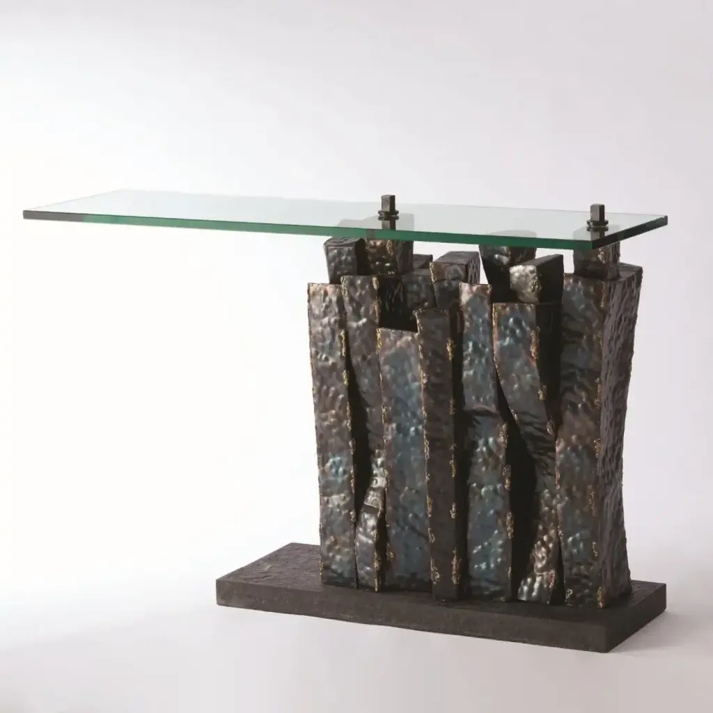 Queue is a tour-de-force of Brutalist style. The base is an assemblage of randomly shaped figures standing in "queue" which support a cantilevered glass top. Attachment points protrude through the glass from the base below. The sheet iron figures are hand-distressed and held together with brass braising, then given a torched finish. All rests on a honed black granite base. From a fashion forward perspective, Global Views offers accessories, furniture, statement lighting, and an assortment of rugs and mirrors to add beauty and joy to your home.