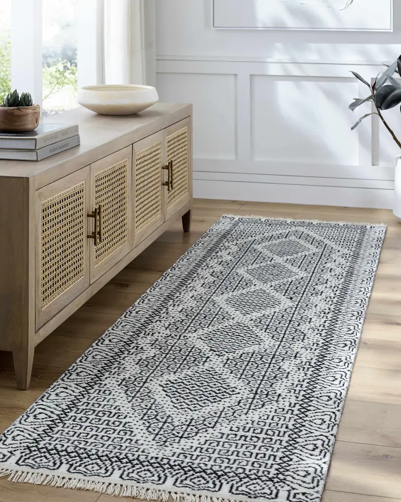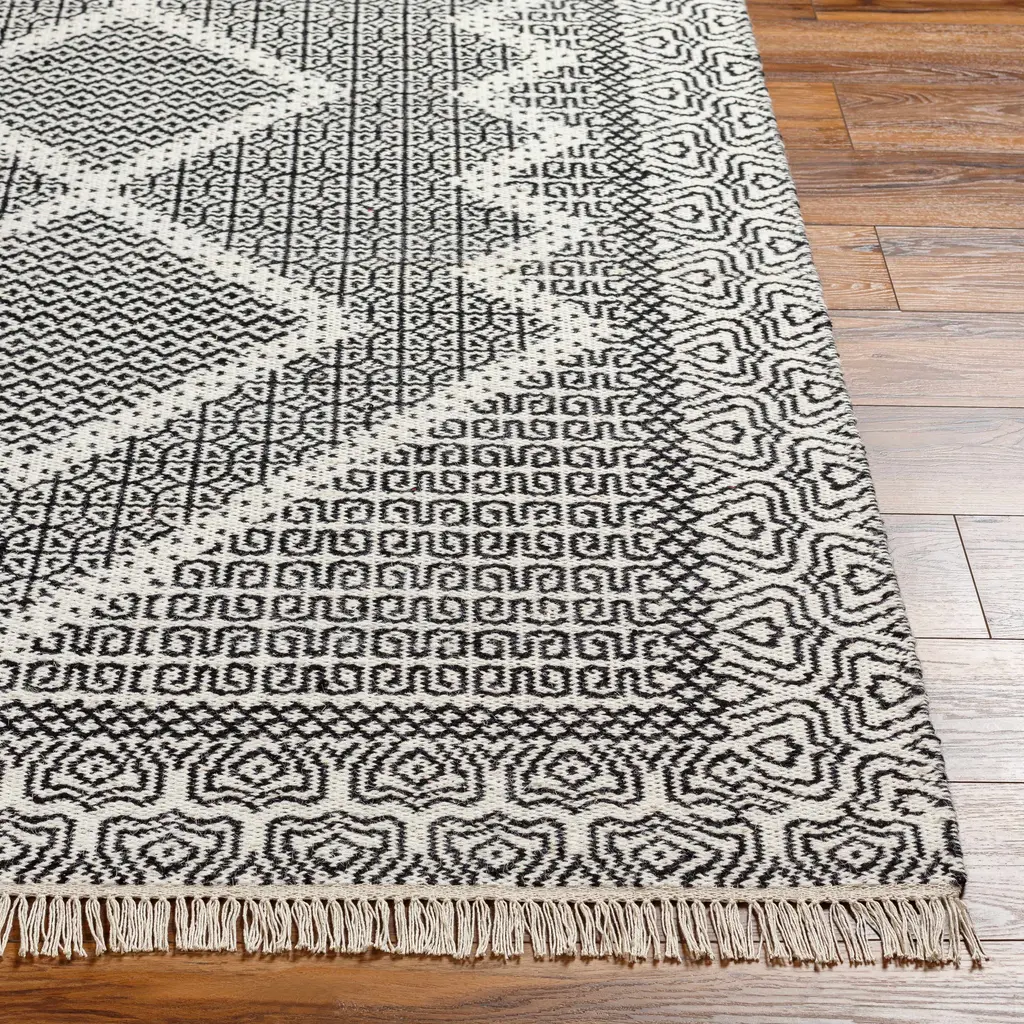 Collection: Rach Colors: Beige, Black Construction: Hand Woven Material: 100% Wool Pile: No Pile Styles: Transitional,Traditional Made In: India Thickness: 0.4" Fringe Length: 2" Price Range: $$$$$ (Affordable)