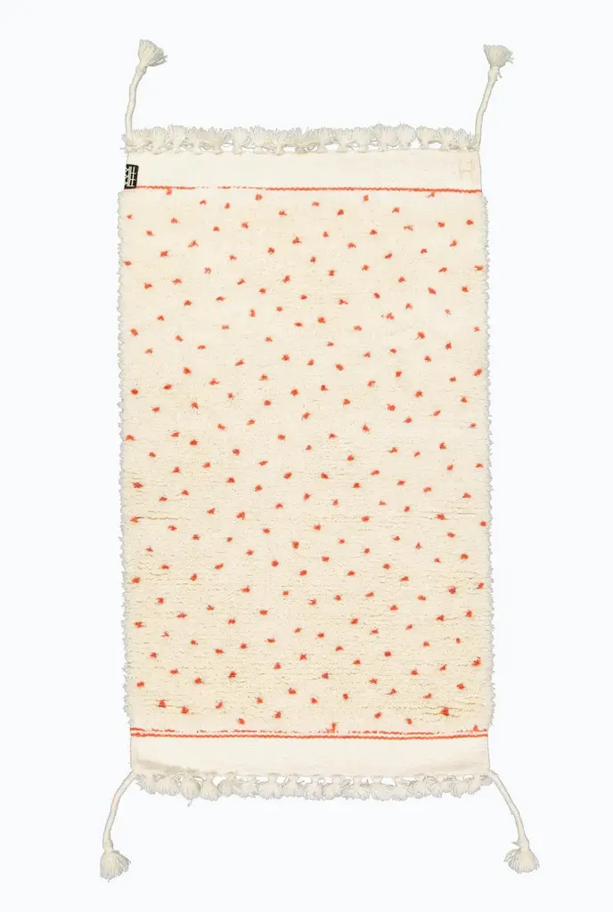 Hand woven wool carpet. Undyed ivory wool with naturally dyed orange wool.