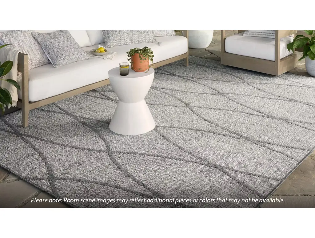 The Loloi Rainier Dove/Grey Area Rug features a contemporary wavy line design that brings artful beauty to any room. Power loomed in Egypt of synthetic fibers for indoor/outdoor durability.