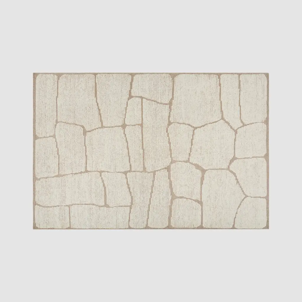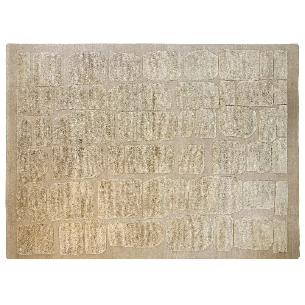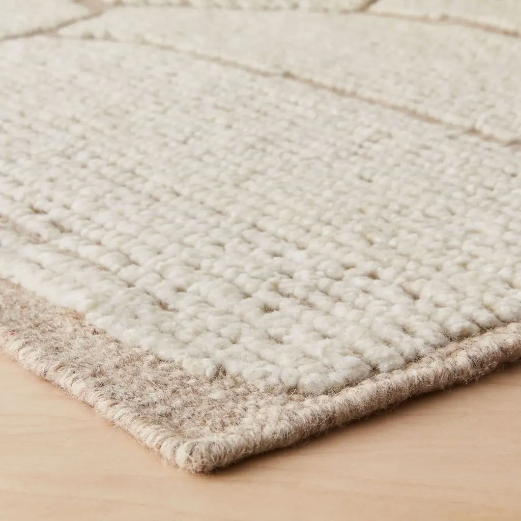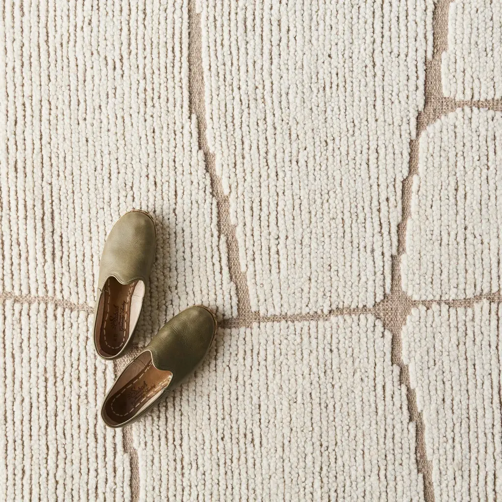 Add an organic touch to your space with this beautiful hand-knotted area rug, inspired by winding garden stones. Take a relaxing walk through the abstract forms of this hand-knotted area rug, inspired by winding garden stones. Bringing the tranquility of nature inside, this beautiful rug pairs an all-natural wool base with a chunkier wool in a lower pile, creating a contrast between calming shades of light mushroom and natural ecru. Style as a plush addition to a study or a quiet nook. Crafted in the Carpet Belt of India, every rug is hand-knotted over days at a workshop in Chedibeer. The work of a collective of over 60 artisans, every piece is made start to finish in a fair trade environment. We recommend a rug pad to prevent wrinkles and slippage. Not sure what size you need? Visit our Rug Size and Style Guide for more information.
