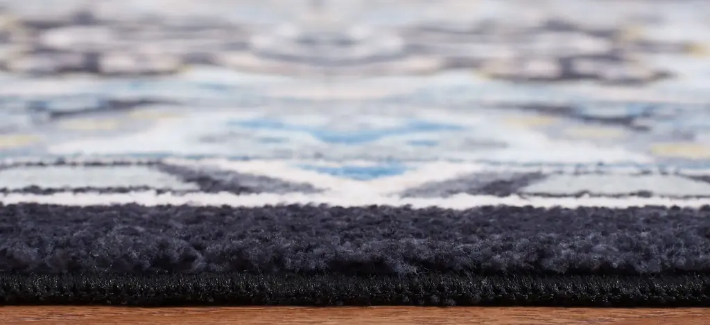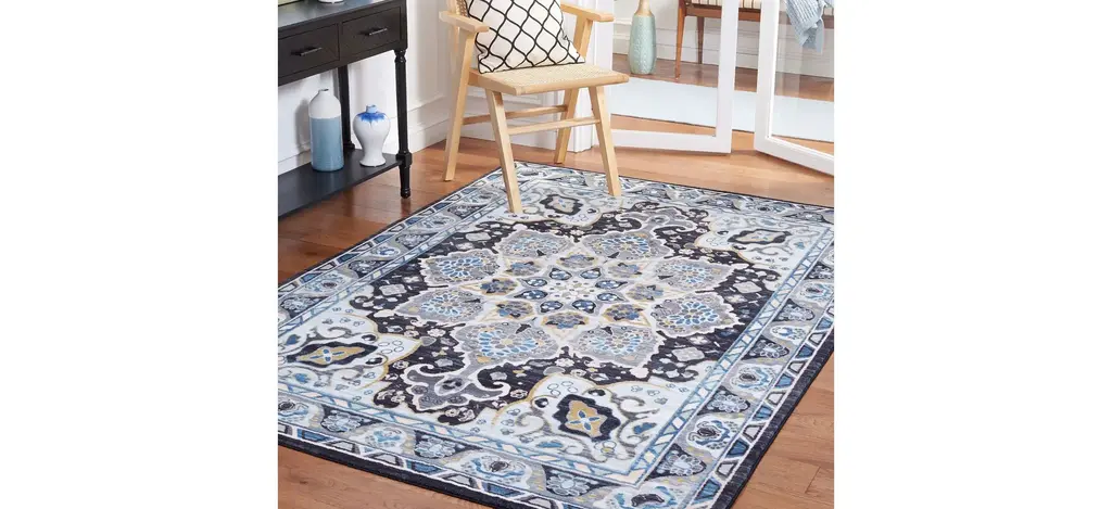 Antique rug artistry is reimagined in the brilliant hues, striking design, and any-room high performance of the Raleah Square Area Rug. This trendy, transitional rug is machine washable, bringing high-style elegance to even the most well-traveled areas of the home. It is made using soft synthetic yarns with a foam latex backing for a comforting feel underfoot and long lasting charm.