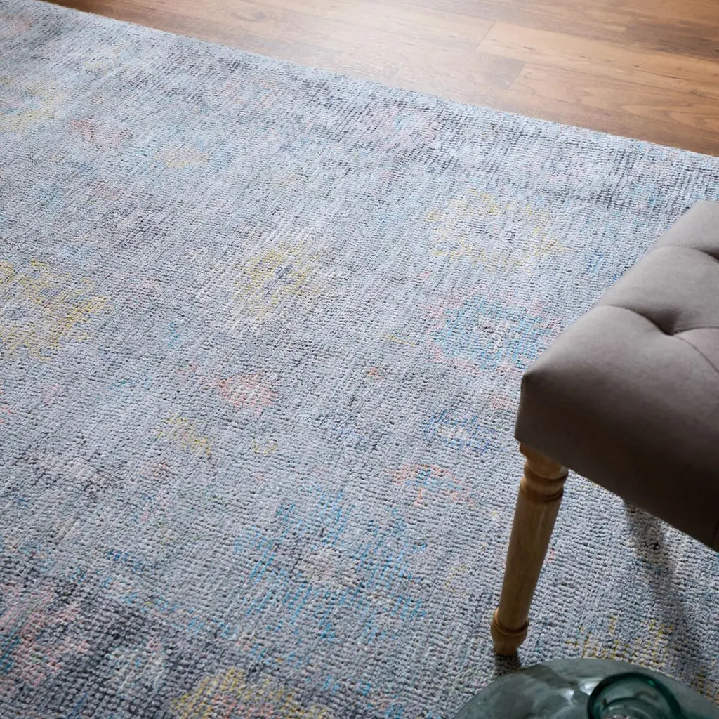 The Ramey Collection has a subtle distressed Persian design in neutral colors of ivory, tan, and blue. These area rugs are hand loomed of wool with viscose tufting in India and tie in a versatile bohemian design style to your home. The Ramey can handle high traffic areas and would be best suited to your living room, dining room, foyer, entryway, or home office. The composition of the collection is made up of space dyed yarns which gives a heavily distressed texture and provides a vintage look and feel. Overall, this technique will create a dark to light or light to dark gradation effect based on yarn exposure during the weaving process. Due to the weaving technique used to create this rug, each are rug created has a different variation. Natural color variations make each rug unique.