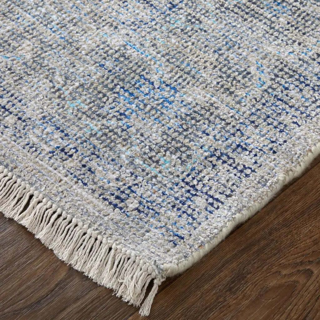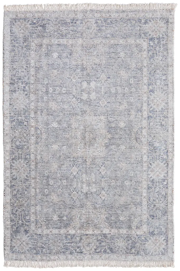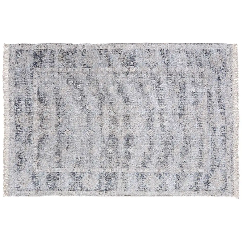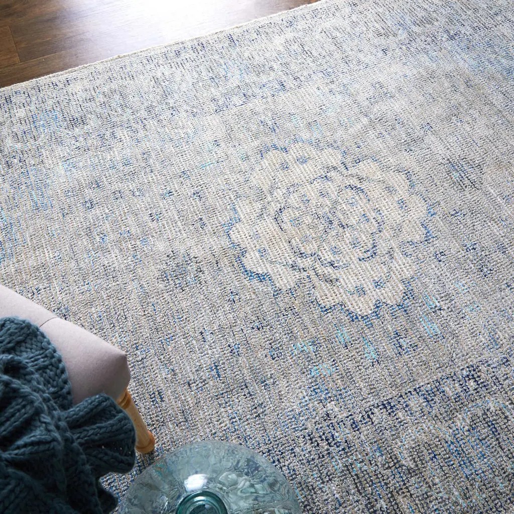 The Ramey Collection has a subtle distressed Persian design in neutral colors of ivory, tan, and blue. These area rugs are hand loomed of wool with viscose tufting in India and tie in a versatile bohemian design style to your home. The Ramey can handle high traffic areas and would be best suited to your living room, dining room, foyer, entryway, or home office. The composition of the collection is made up of space dyed yarns which gives a heavily distressed texture and provides a vintage look and feel. Overall, this technique will create a dark to light or light to dark gradation effect based on yarn exposure during the weaving process. Due to the weaving technique used to create this rug, each are rug created has a different variation. Natural color variations make each rug unique.