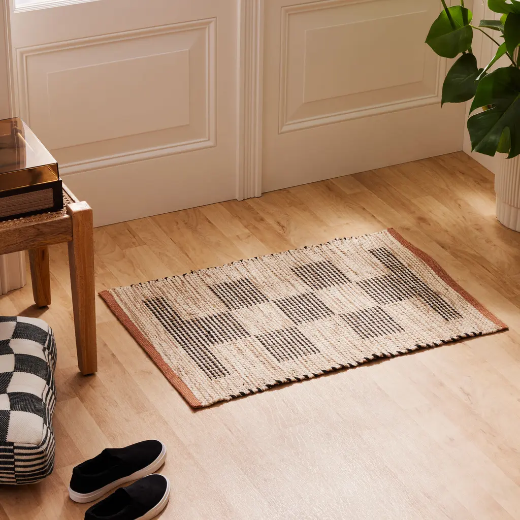 Hand-loomed of jute and cotton by masterful Indian artisans, our Rapa 2x3 area rug features a light neutral ground dotted with bold block patterns in contrast black. Detailed with terracotta borders and a blanket-stitched edge, this handmade accent rug fills its looks with woven texture. A grounding scatter rug for kitchens, bathrooms and other small spaces, the linear geometry of its dot-stitched design is understated and sophisticated.
