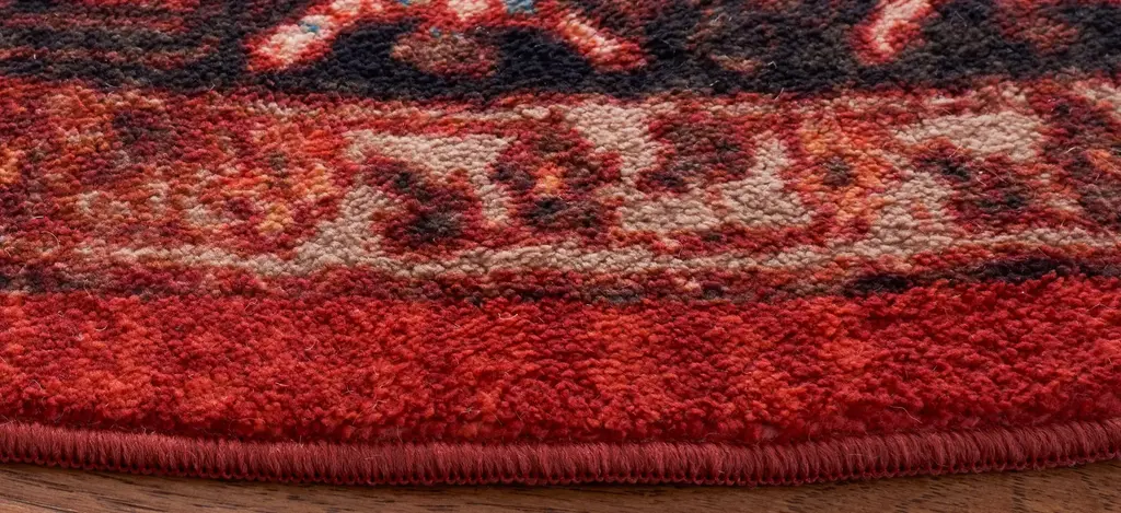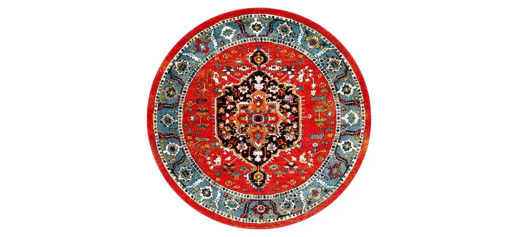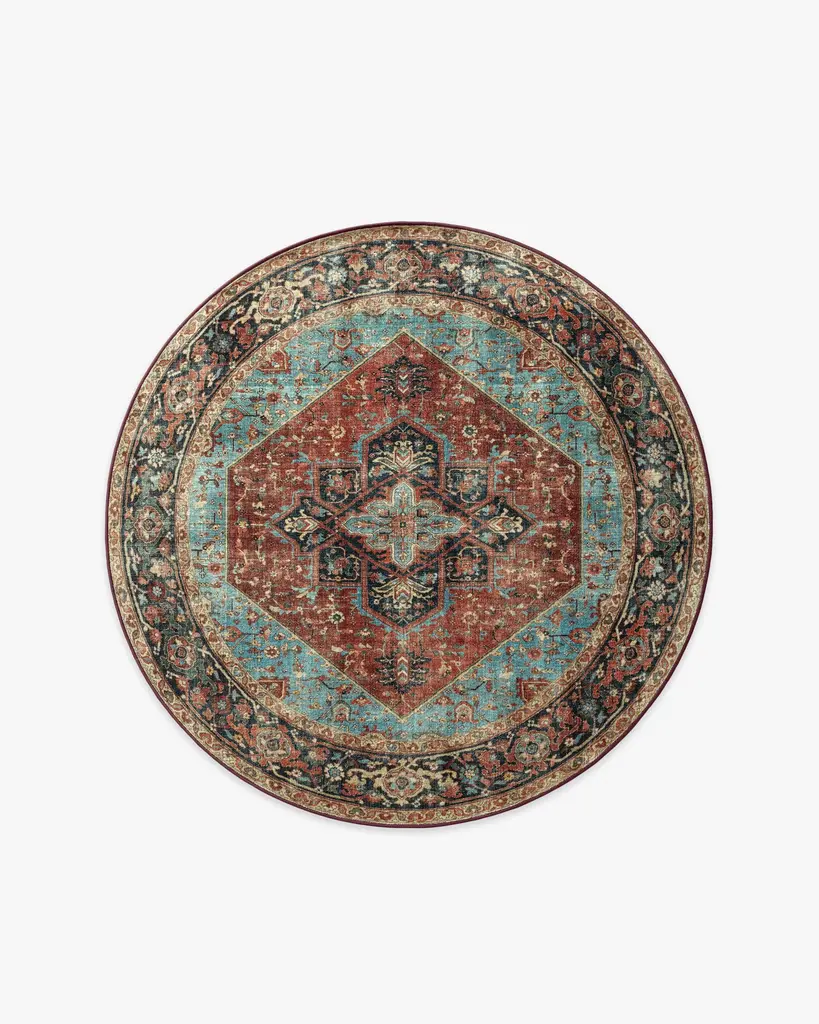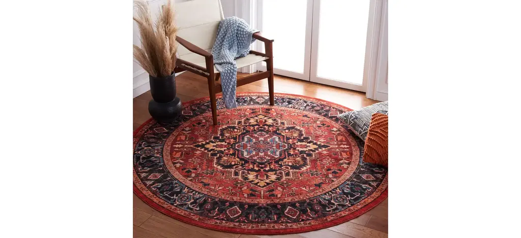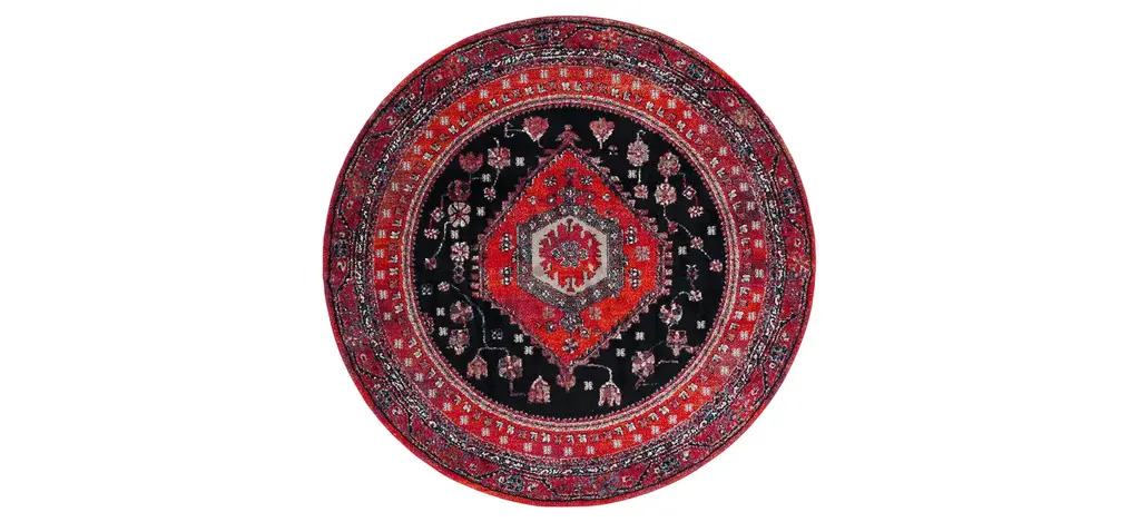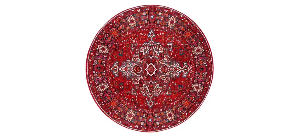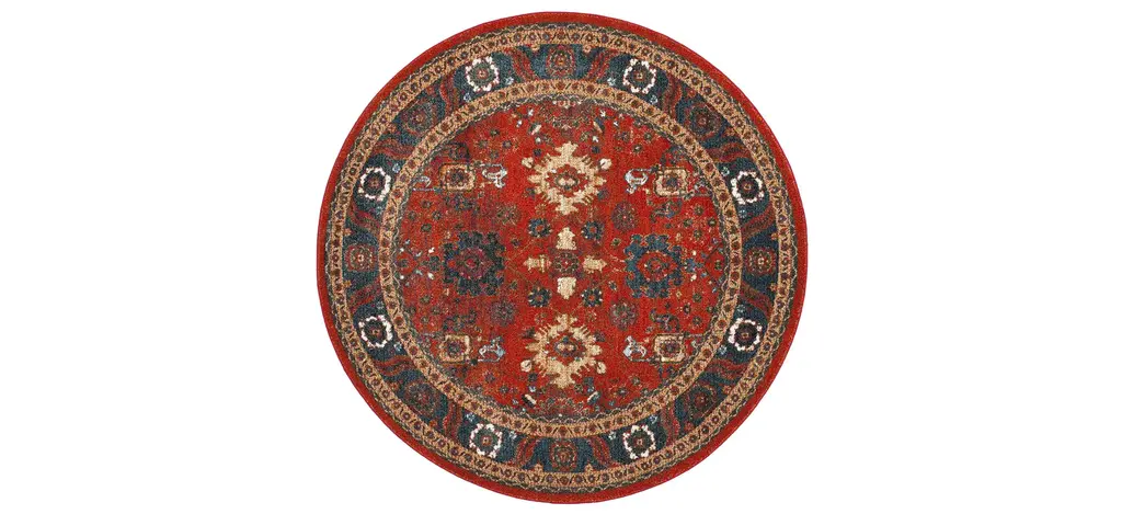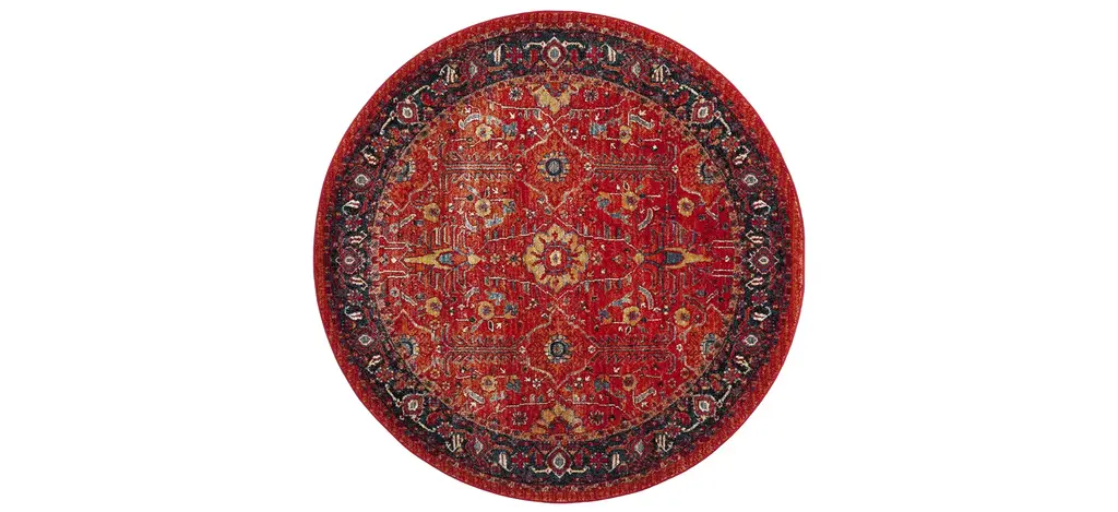 Antique rug artistry is reimagined in the brilliant hues, striking design, and any-room high performance of the Rasmin Round Area Rug. This trendy, transitional rug is machine washable, bringing high-style elegance to even the most well-traveled areas of the home. It is made using soft synthetic yarns with a foam latex backing for a comforting feel underfoot and long lasting charm.