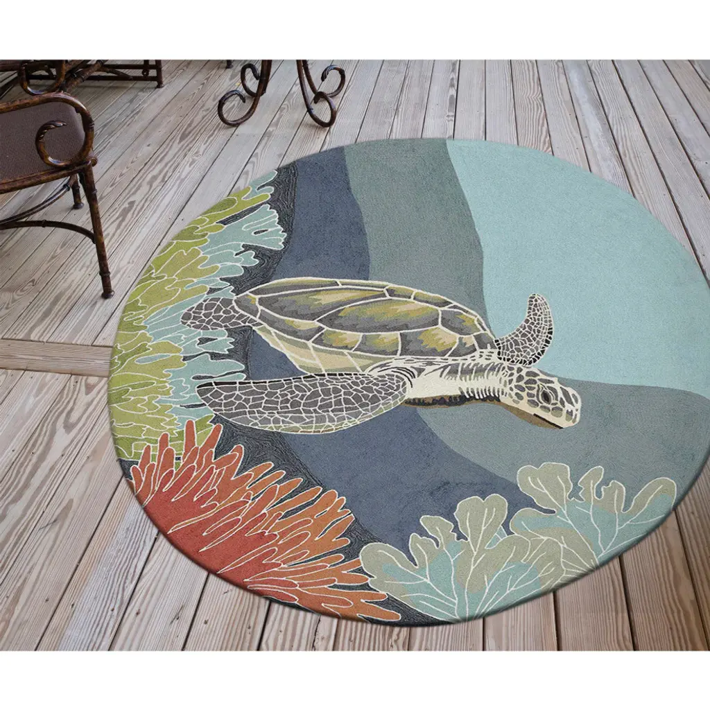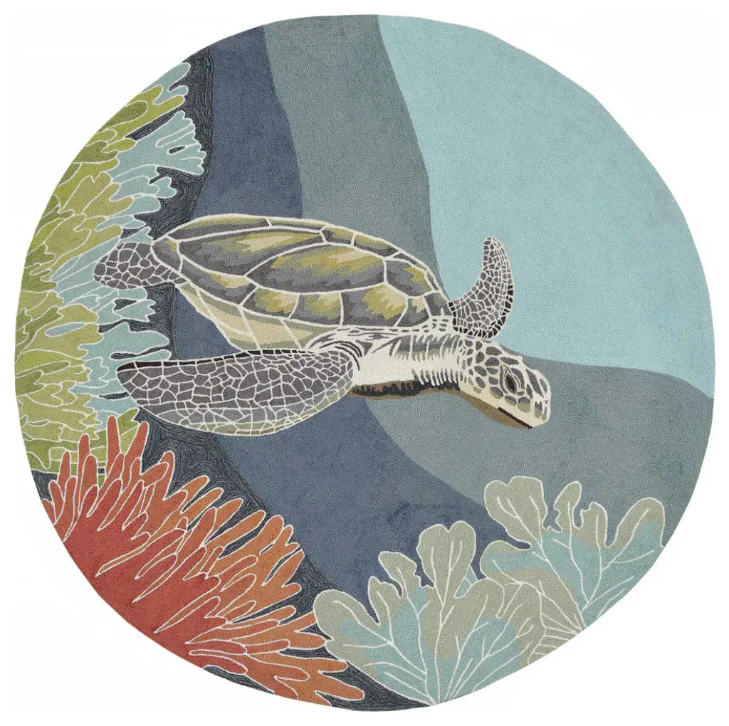 This hand-hooked area rug is one of our most popular designs. A lifelike sea turtle swims peacefully underwater in this artistic rendition that will make a colorful impact on any indoor or outdoor space. Made in China from a polyester acrylic blend, the Ravella Collection is hand tufted to create vibrant multi-toned detailed designs with tight textural loops and a high quality finish. The material is flatwoven, weather resistant and treated for added fade resistance, making this area rug perfect for indoor or outdoor placement. This soft, durable area rug is ideal for your patio, sunroom or those high traffic areas such as your kitchen, living room, entryway or dining room. Intricately shaded yarns bring to life the nature inspired designs of this collection that will beautifully accent your home. Limiting exposure to rain, moisture and direct sun will prolong rug life. Expertly hand tufted and imported from ChinaIntended for both Indoor and Outdoor UseMade from weather resistant Polyester/Acrylic blend for high traffic areas and Indoor/Outdoor placementPile height 0.5" Both Water and Fade Resistant Backing Material: PolyesterThis design features a sea turtle swimming peacefully though the waterThis design features a multi-hued blue background with green, blue and orange sea life and a delicately shaded turtle. Rug Size: 8'' Round