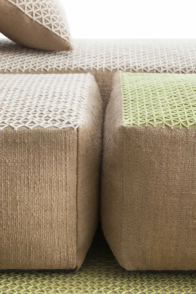 http://www.gan-rugs.com/en/products/spaces/raw/puf-tipologia-raw/The RAW collection designed by Borja García is a declaration of honesty and authenticity in design, even its name is synonymous with purity and strength. “Natural materials have always interested me, their pure state, almost untouched,” outlines the designer.Natural materials constitute a blank canvas on which different designs are traced, framing each element of the collection that includes carpets, poufs and cushions, within a playful context that simultaneously expresses two ideas. The designer takes inspiration from the traditional architecture of the Mediterranean. “The houses designed by Coderch, Bonet and Spain of the 1960s have left us with a palette of raw materials and elemental solutions that are highly seductive. This cocktail is presented through RAW, either directly or indirectly through its materiality and geometry,” explains Borja García.A design that recovers traditional techniques and brings them into a contemporary context.A smooth layer of wool is laid over the jute base, combining two seemingly discordant languages but which work here in harmony. The clean lines of the permeable geometry of this secondary overlay lend the classical material a contemporary and modern expression. With the GAN stamp of quality, the indoor brand belonging to GANDIABLASCO the RAW collection reinforces the link between product and the brands in-house design.