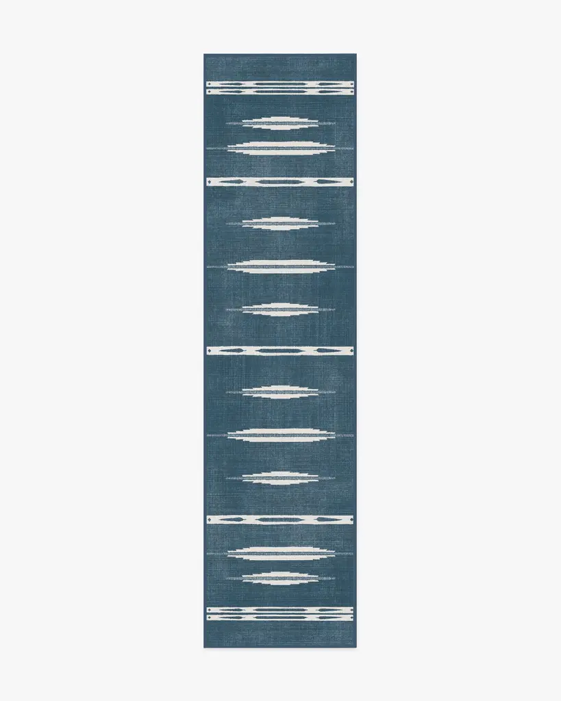 Inspired by classic Southwestern-style stripes, our Raye Indigo & Ivory Rug strikes a perfect balance between bold motifs and delicate hatchwork details in a palette of ivory and indigo blue. Water-resistant, stain-resistant, and machine-washable. Rug colors may vary slightly according to your device and the lighting in your space.