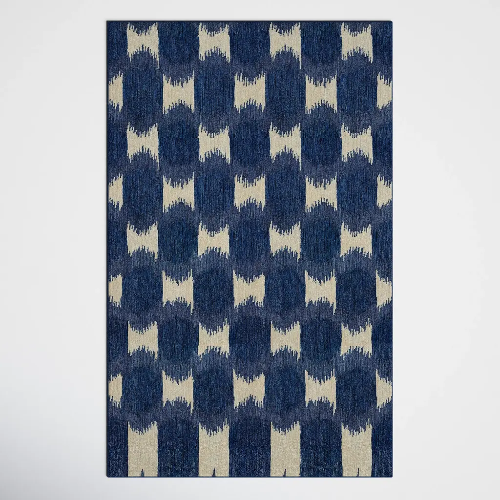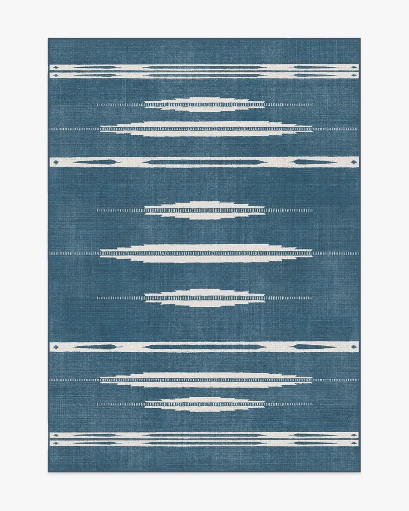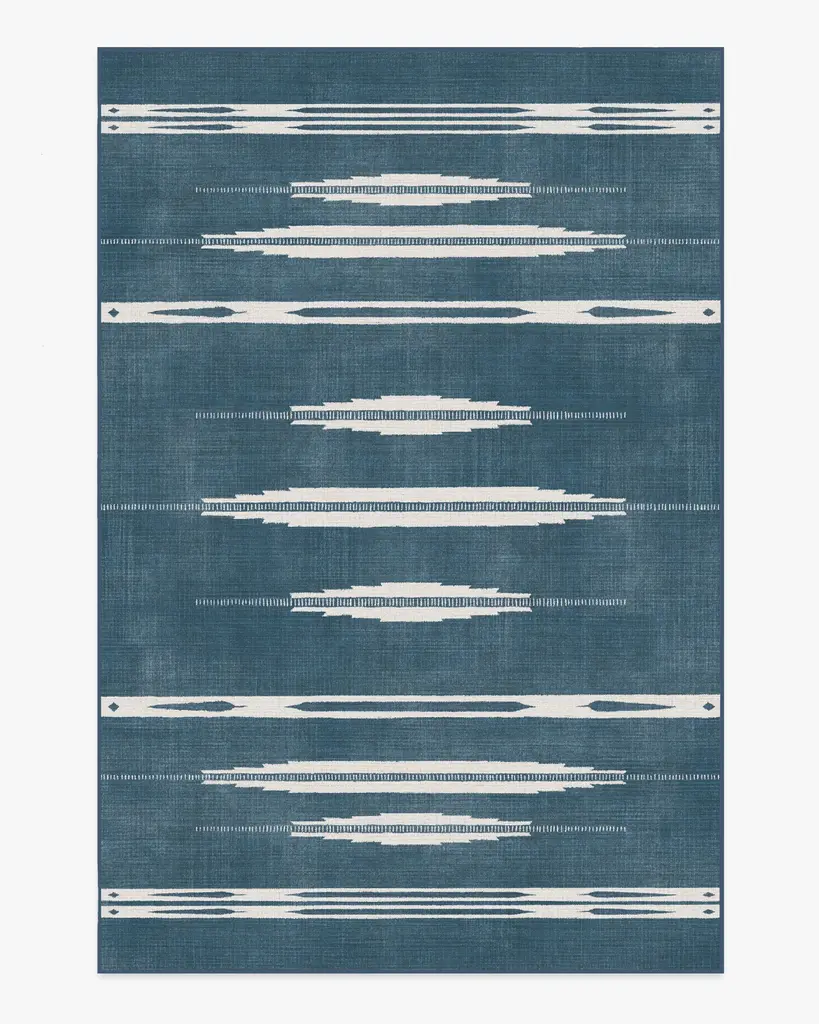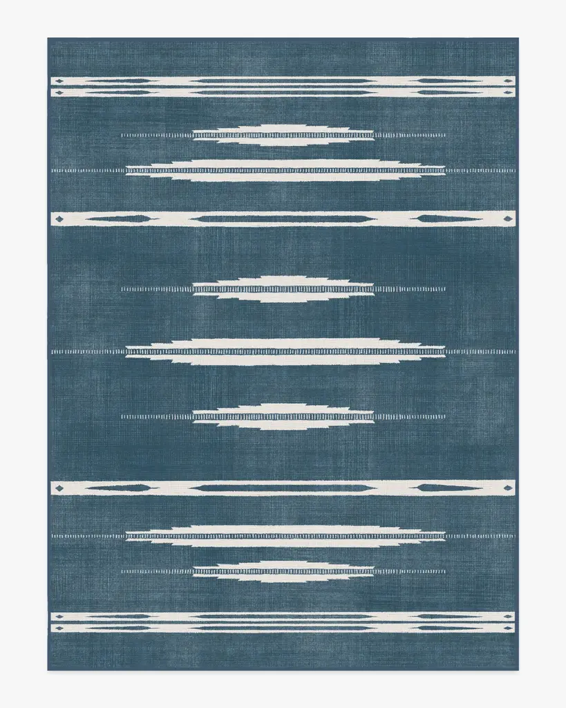 Inspired by classic Southwestern-style stripes, our Raye Indigo & Ivory Rug strikes a perfect balance between bold motifs and delicate hatchwork details in a palette of ivory and indigo blue. Water-resistant, stain-resistant, and machine-washable. Rug colors may vary slightly according to your device and the lighting in your space.
