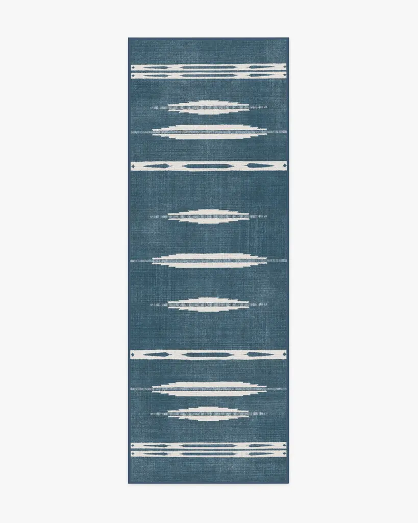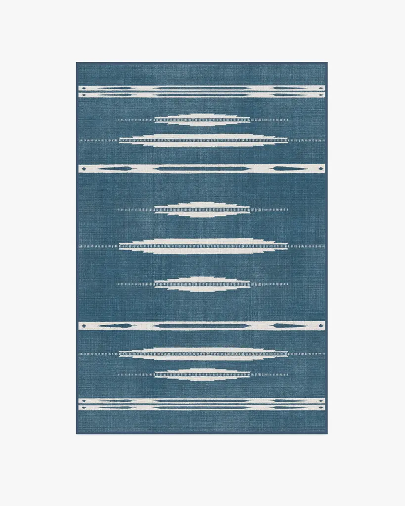Inspired by classic Southwestern-style stripes, our Raye Indigo & Ivory Rug strikes a perfect balance between bold motifs and delicate hatchwork details in a palette of ivory and indigo blue. Water-resistant, stain-resistant, and machine-washable. Rug colors may vary slightly according to your device and the lighting in your space.