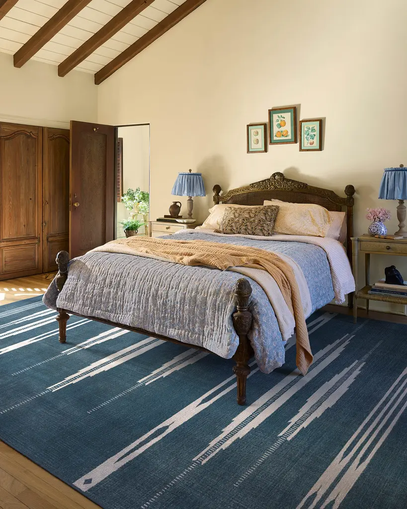 Inspired by classic Southwestern-style stripes, our Raye Indigo & Ivory Rug strikes a perfect balance between bold motifs and delicate hatchwork details in a palette of ivory and indigo blue. Water-resistant, stain-resistant, and machine-washable. Rug colors may vary slightly according to your device and the lighting in your space.