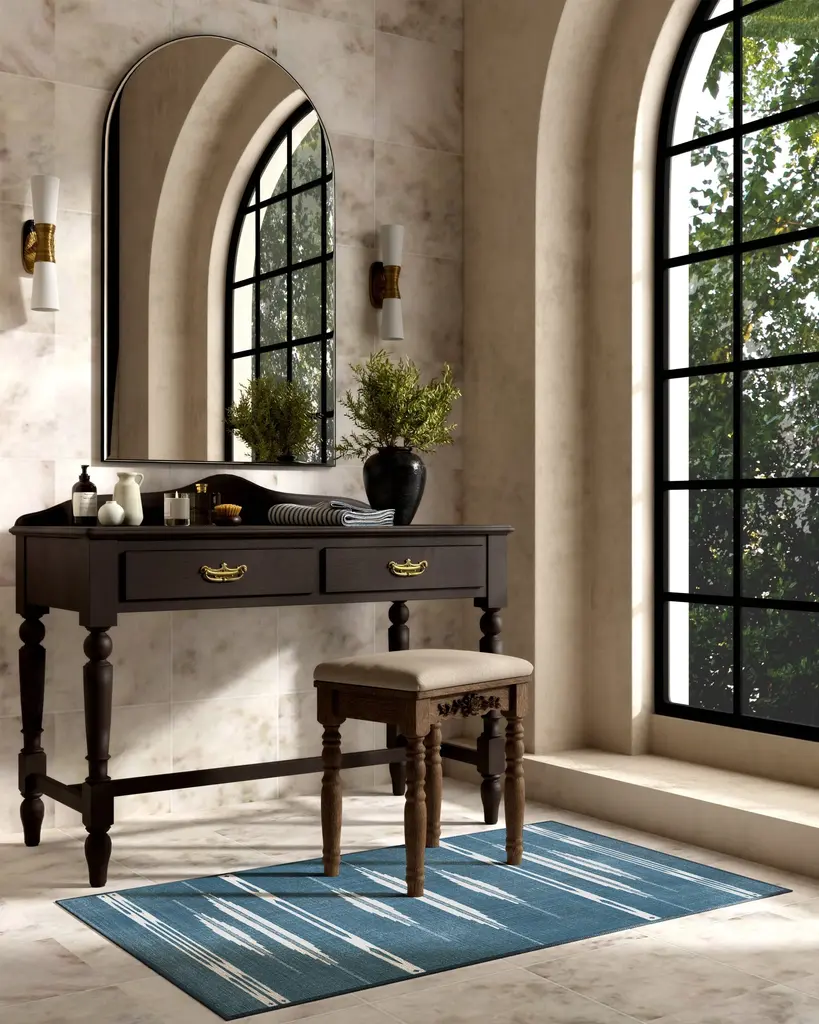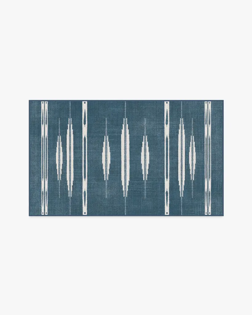 Inspired by classic Southwestern-style stripes, our Raye Indigo & Ivory Rug strikes a perfect balance between bold motifs and delicate hatchwork details in a palette of ivory and indigo blue. Water-resistant, stain-resistant, and machine-washable. Rug colors may vary slightly according to your device and the lighting in your space.