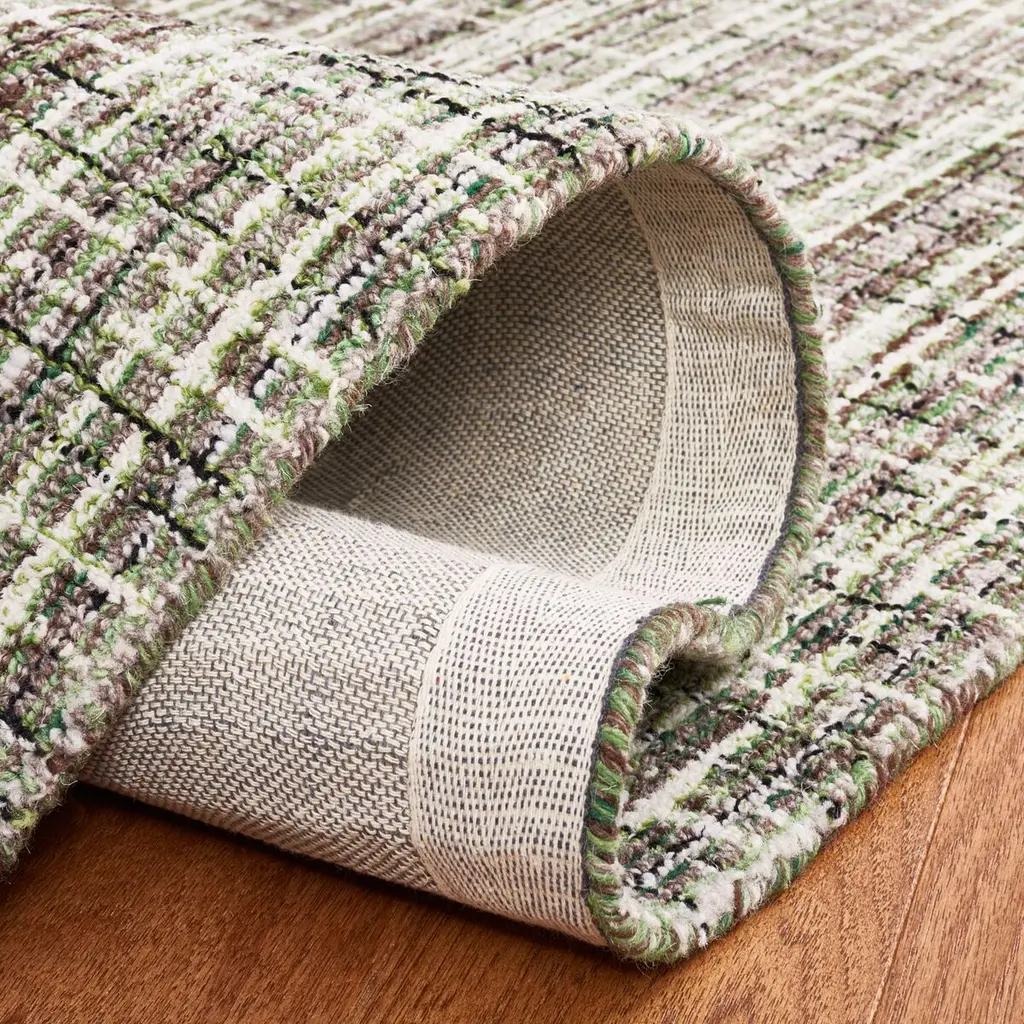Elevate your interior space with this stunning 4' X 6' area rug, intricately hand-tufted in India. Crafted from a luxurious blend of 85% wool and 15% cotton, it offers both comfort and durability. This small rectangular rug, with a pile height of 3/8", provides a subtle tactile experience underfoot. Exuding modern elegance, the rug presents a harmonious combination of brown and green tones, forming a versatile color palette that complements your contemporary decor. The sophisticated pattern displayed in the image embodies a delicate fusion of lines, providing a serene yet dynamic aesthetic to any room. Although this exquisite piece is not washable and lacks slip resistance, its quality construction and timeless design ensure it remains a centerpiece in your home for years to come. Add a touch of modern sophistication to your floors with this beautiful artistic expression.