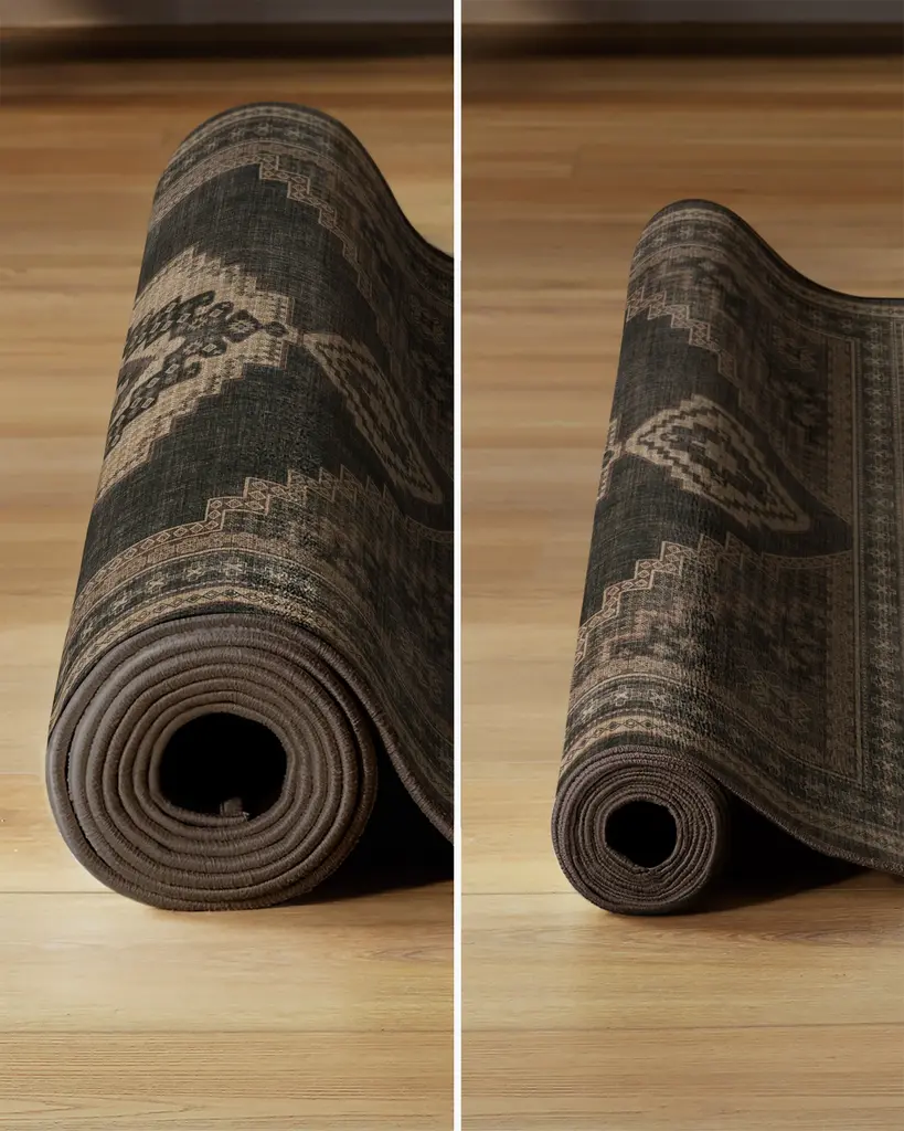 Elevate your favorite space with our distressed Rayne Charcoal & Tan Rug. Inspired by intricate artistry, this globally-inspired design features an ornate border and deep grey and warm taupe motifs, complemented by subtle pops of wine red. Water-resistant, stain-resistant, and machine-washable. Rug colors may vary slightly according to your device and the lighting in your space.