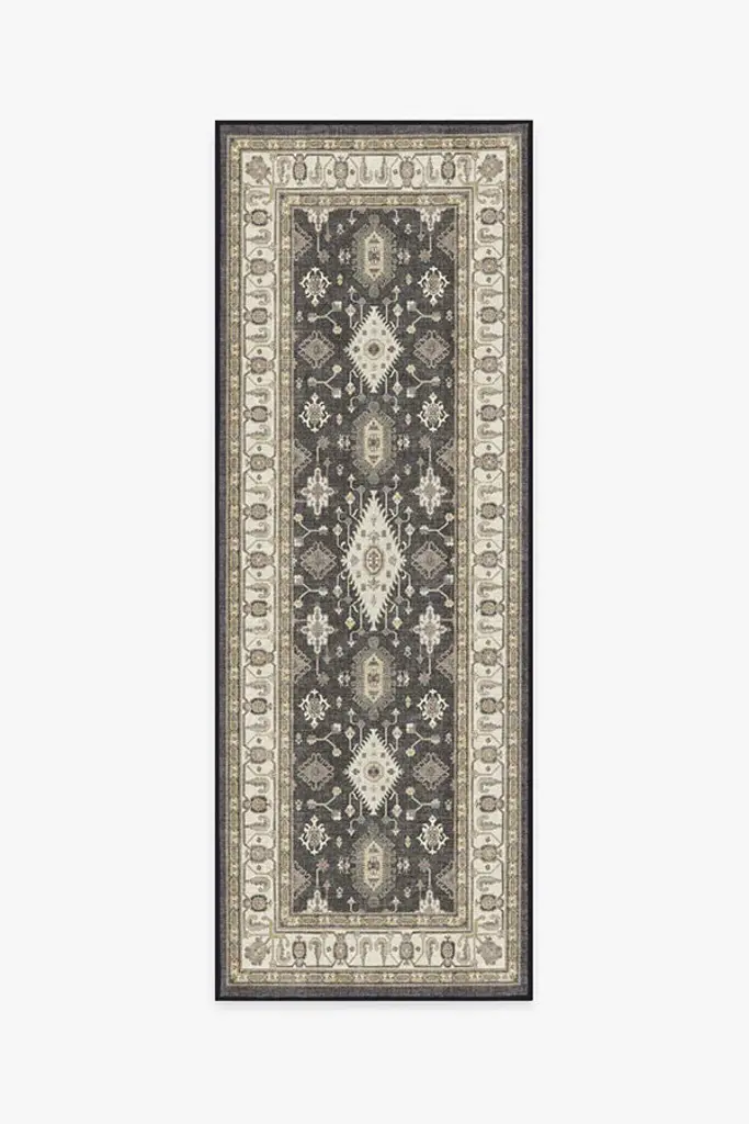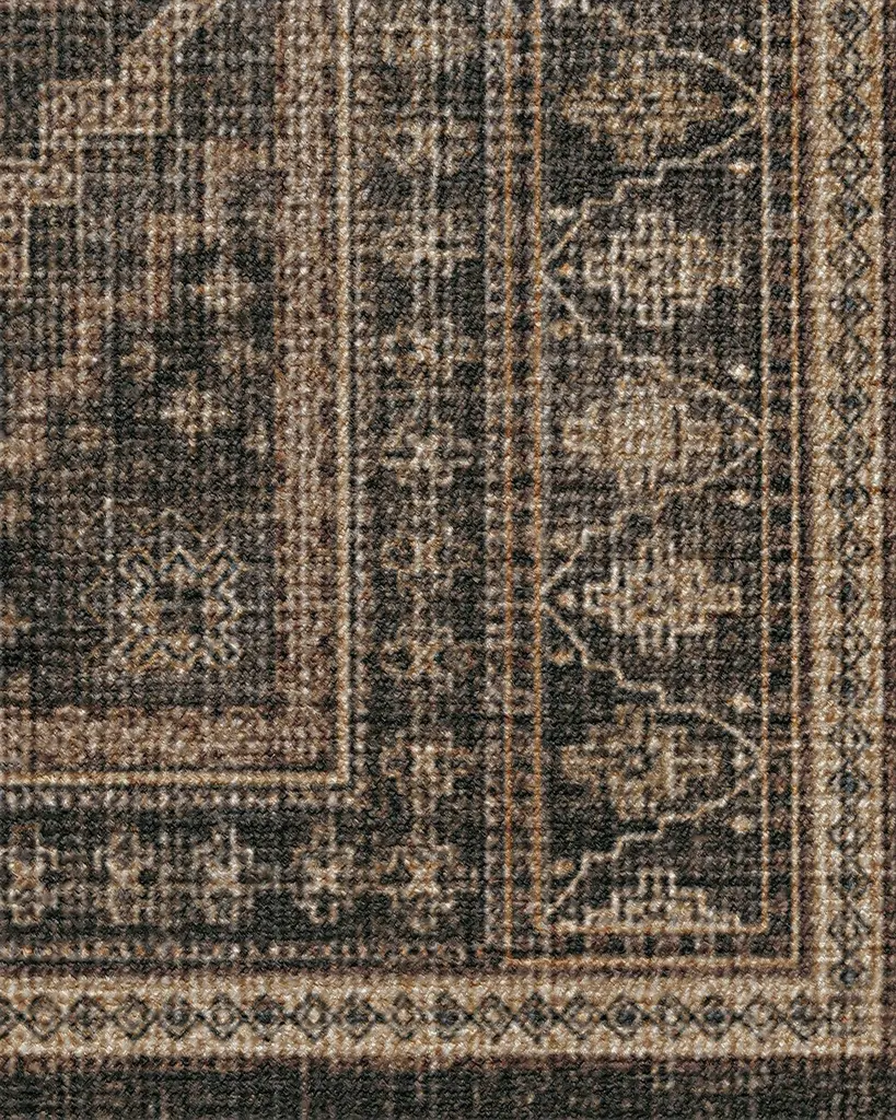 Elevate your favorite space with our distressed Rayne Charcoal & Tan Rug. Inspired by intricate artistry, this globally-inspired design features an ornate border and deep grey and warm taupe motifs, complemented by subtle pops of wine red. Water-resistant, stain-resistant, and machine-washable. Rug colors may vary slightly according to your device and the lighting in your space.