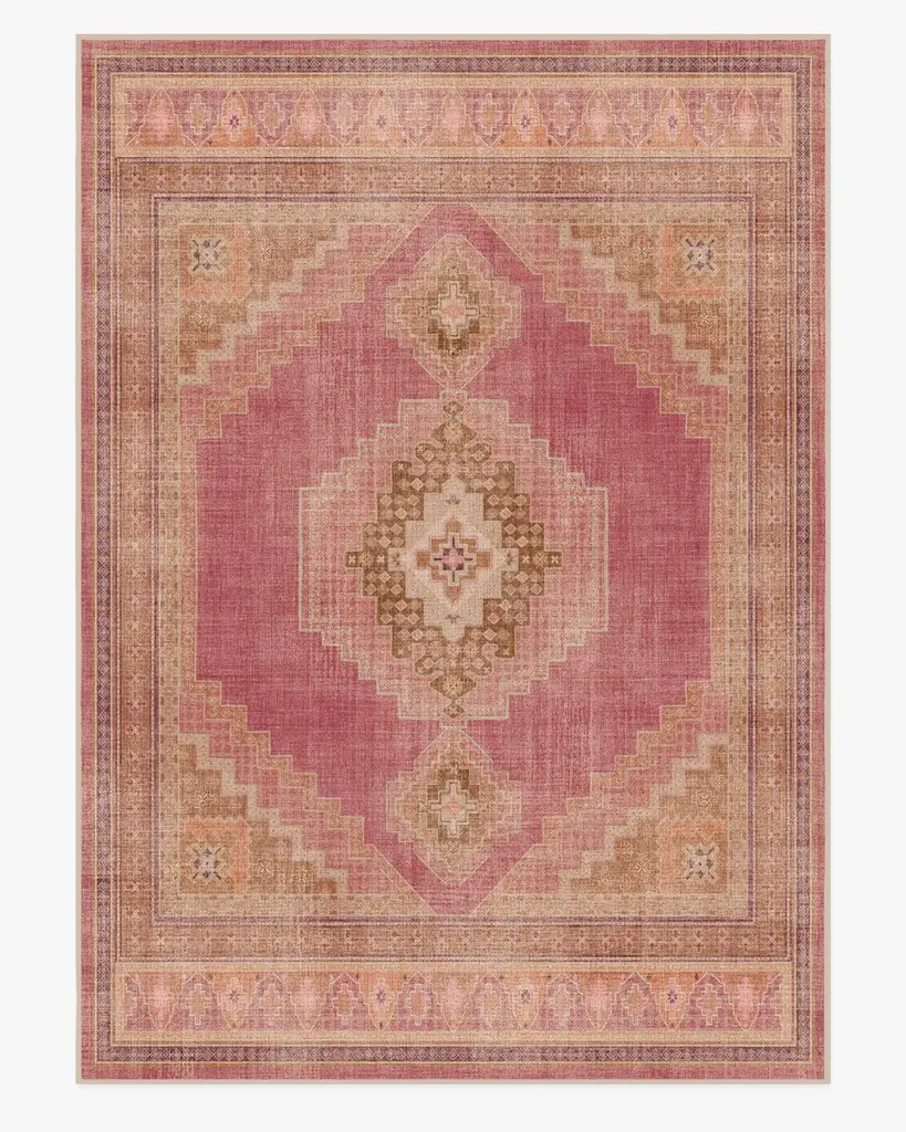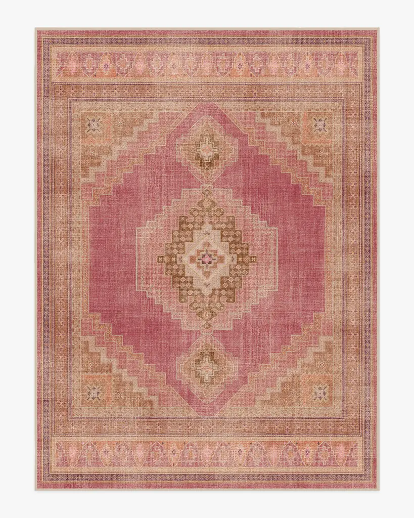 Elevate your favorite space with our distressed Rayne Pink & Orange Rug. Inspired by intricate artistry, this globally-inspired design features an ornate border and captivating fuchsia and pink medallions complemented by hints of orange and cream. Water-resistant, stain-resistant, and machine-washable. Rug colors may vary slightly according to your device and the lighting in your space.