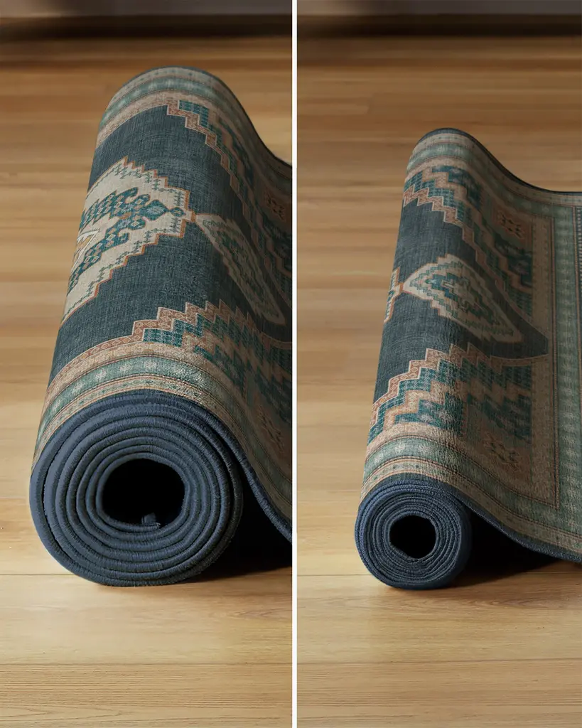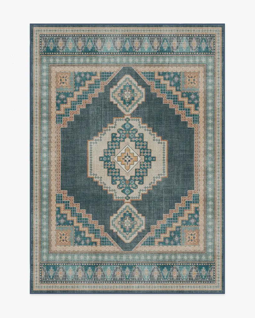 Elevate your favorite space with our distressed Rayne Soft Navy Rug. Inspired by intricate artistry, this globally-inspired design features an ornate border and soft teal and cream medallions complemented by pops of orange and yellow. Water-resistant, stain-resistant, and machine-washable. Rug colors may vary slightly according to your device and the lighting in your space.
