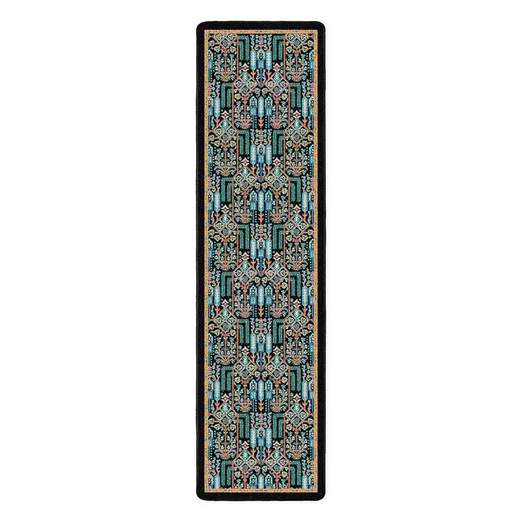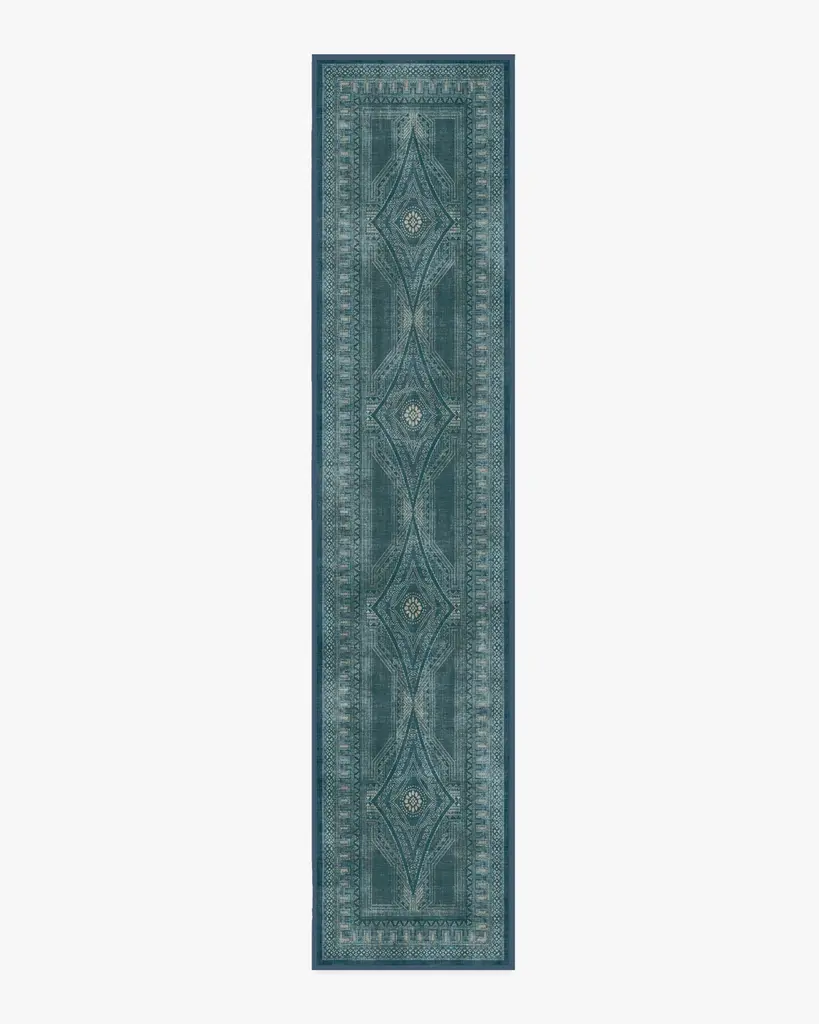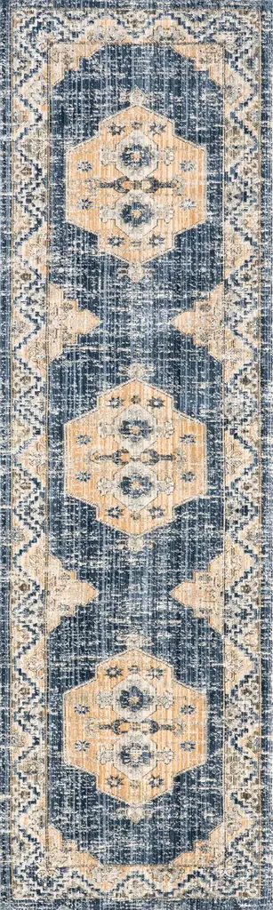 Elevate your favorite space with our distressed Rayne Soft Navy Rug. Inspired by intricate artistry, this globally-inspired design features an ornate border and soft teal and cream medallions complemented by pops of orange and yellow. Water-resistant, stain-resistant, and machine-washable. Rug colors may vary slightly according to your device and the lighting in your space.