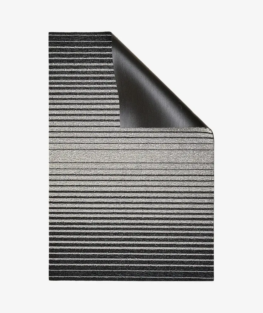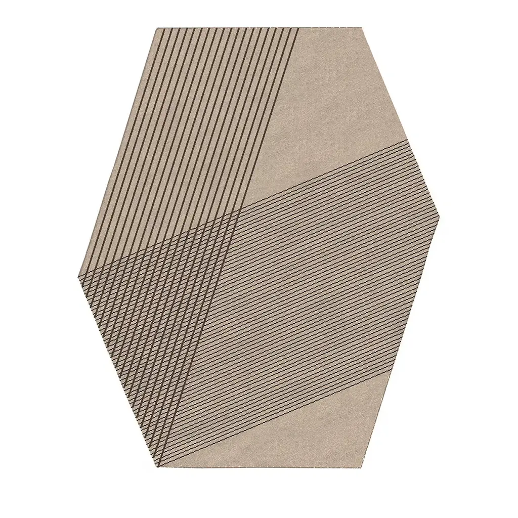 This rug exudes an unmistakable devotion to geometry, the audacity of its irregular polygonal shape further enriched by the couple of partially overlapping striped patterns. The exclusive "kilim" process is behind its flat fleece, which is deftly woven in India from a blend of prized local wools. Daring in its lines as it is quiet in its palette, the design is also available in a gray-toned color variant.