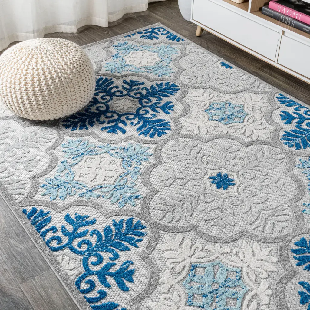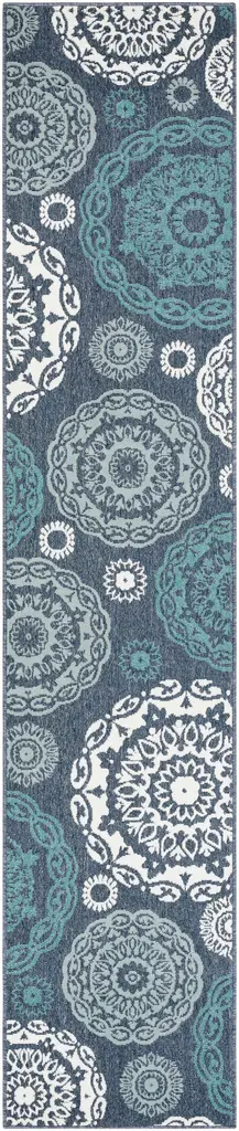 Collection: Reasnor Colors: Teal, White, Navy, Pale Blue Construction: Machine Woven Material: 100% Olefin Pile: No Pile Styles: Transitional,Traditional Outdoor Safe: Yes Made In: Egypt Thickness: 0.16" Price Range: $$$$$ (Most Affordable)