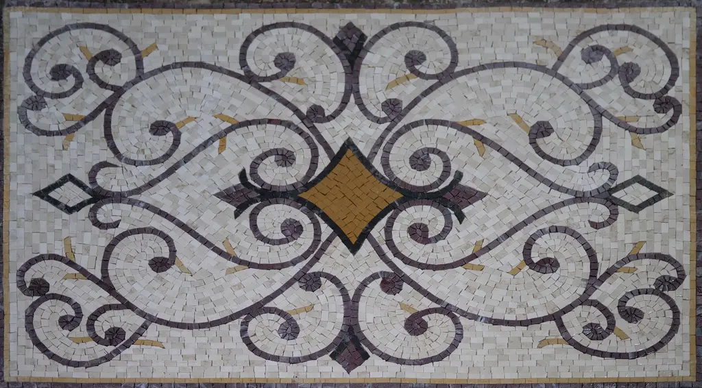 Transform your living space with the stunning Rectangular Rug Mosaic - Varina, an exquisite piece designed to elevate the aesthetic of any room. This luxurious rug features a captivating warm golden brown scroll pattern, beautifully complemented by elegant white diamond accents that stand out against a rich black background. The intricate design captures the essence of sophistication and artistry, making it a perfect addition to your kitchen walls or decorative tile floors.Each Varina rug is handmade with meticulous attention to detail, ensuring that every piece is unique and crafted to perfection. Whether you’re looking to enhance your home’s decor or add a touch of elegance to your space, this rectangular mosaic rug promises to deliver the charm and character you desire. With four standard sizes available, you can easily find the right fit for your needs. If you require something specific, we also offer custom sizing options to ensure that your new rug fits beautifully in your chosen location.The Varina rug is not only a stunning decorative piece but also a practical addition to your home. Its durable materials make it suitable for high-traffic areas, while the intricate mosaic design allows for easy maintenance, ensuring it remains a focal point for years to come. Update your interiors with this stylish rug that radiates warmth and sophistication, inviting both admiration and comfort.Elevate your decor with the Rectangular Rug Mosaic - Varina and experience the perfect blend of art and functionality. Order yours today and enjoy the unique style it brings to your home!