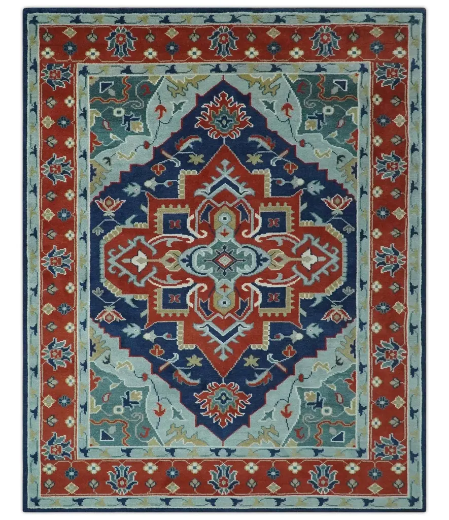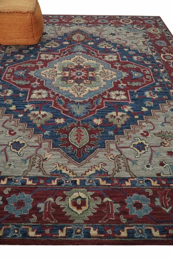 This Hand-Tufted Rug has been Made with Wool. The beautiful colors of the rug carry a legacy of the famous Heriz rug, the traditional design of the rug completes your space without making it look busy. Heriz rugs are durable and can last for decades if treated right. Hand-Tufted Rug All sizes are made to order in 30-45 Days Made with Wool Loop Pile Color: Red and Blue Heriz rugs have been made for centuries and carry a tradition and art. This specific rug is made in India, in the city of Bhadohi. Bhadohi is one of the biggest rug manufacturing cities. Carpet weaving in the region dates back to the 16th century during the reign of Akbar. The skilled artisans of Bhadohi have been carrying the tradition of rug-making for centuries. USERS GUIDE Avoid prolonged moisture Vacuum regularly and/or shake to remove dust Do not pull any loose threads. Use scissors to simply cut the ends Blot spills immediately with a white cloth. Harsh chemicals may damage or fade the rug Use rug protectors under heavy furniture
