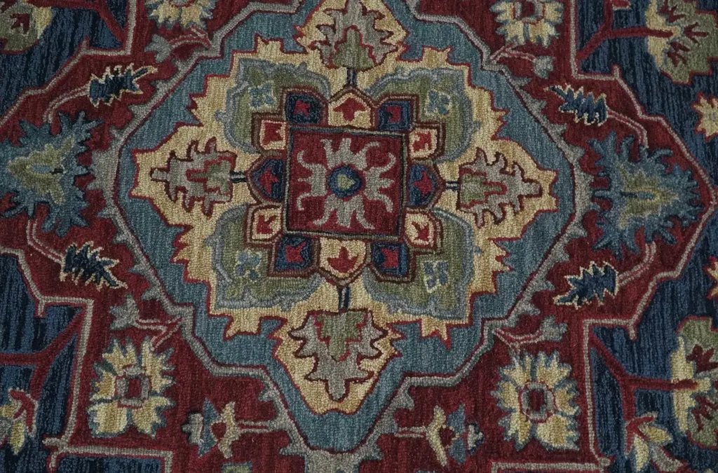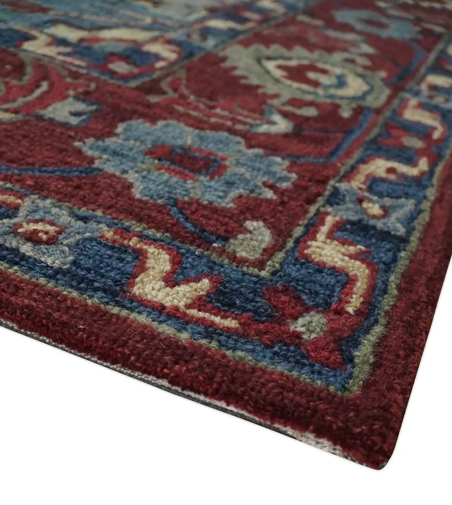 This Hand-Tufted Rug has been Made with Wool. The beautiful colors of the rug carry a legacy of the famous Heriz rug, the traditional design of the rug completes your space without making it look busy. Heriz rugs are durable and can last for decades if treated right. Hand-Tufted Rug All sizes are made to order in 30-45 Days Made with Wool Loop Pile Color: Red and Blue Heriz rugs have been made for centuries and carry a tradition and art. This specific rug is made in India, in the city of Bhadohi. Bhadohi is one of the biggest rug manufacturing cities. Carpet weaving in the region dates back to the 16th century during the reign of Akbar. The skilled artisans of Bhadohi have been carrying the tradition of rug-making for centuries. USERS GUIDE Avoid prolonged moisture Vacuum regularly and/or shake to remove dust Do not pull any loose threads. Use scissors to simply cut the ends Blot spills immediately with a white cloth. Harsh chemicals may damage or fade the rug Use rug protectors under heavy furniture