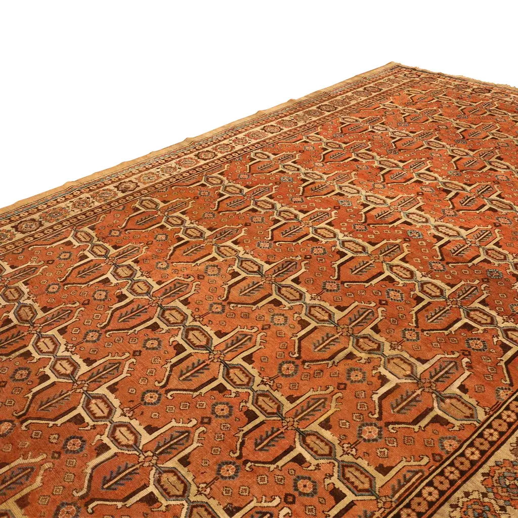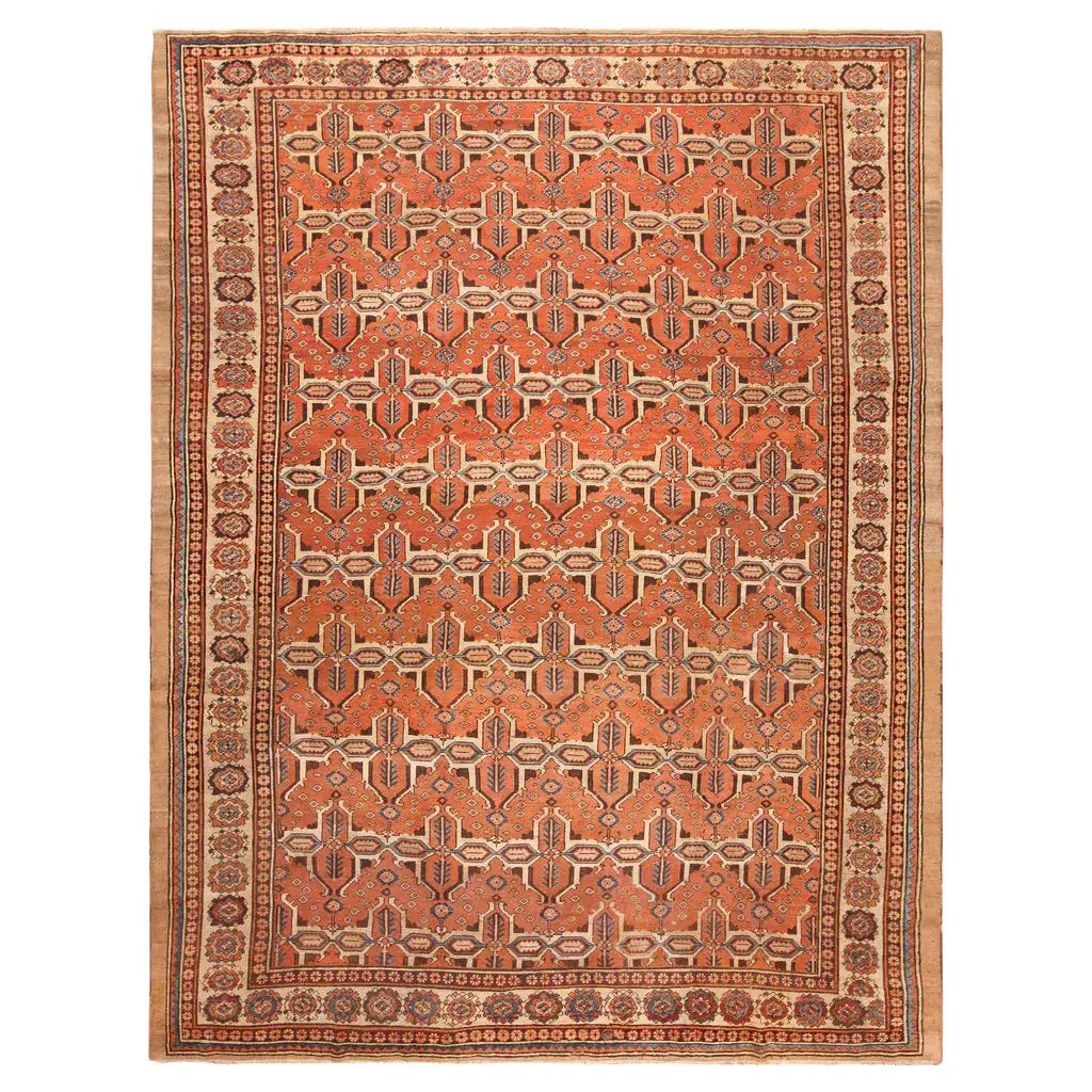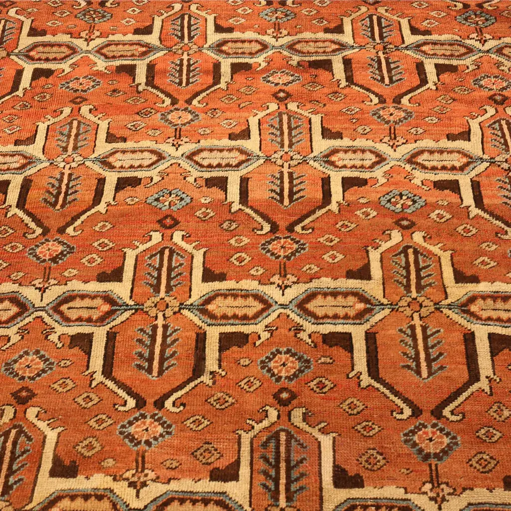 The Red Antique Traditional Persian Bakshaish Rug features a rich terracotta field with intricate geometric and floral motifs in shades of dark blue, beige, and white. Hand Knotted in Iran from high-quality wool, this 10'10" x 14'1" rug showcases meticulous craftsmanship and traditional design. Appreciate the sophisticated beauty of this ornate piece for your home.