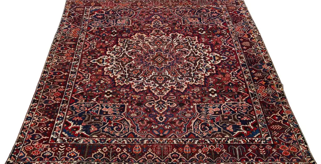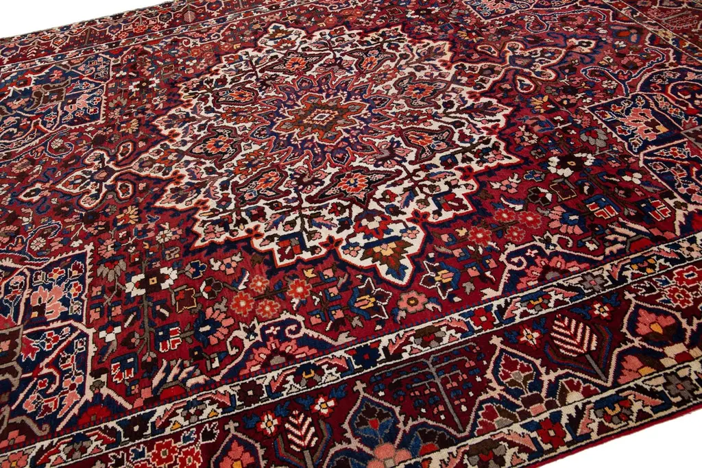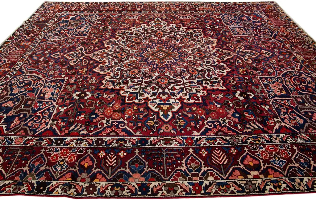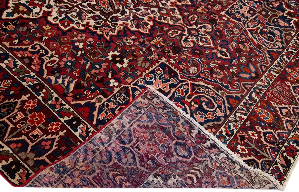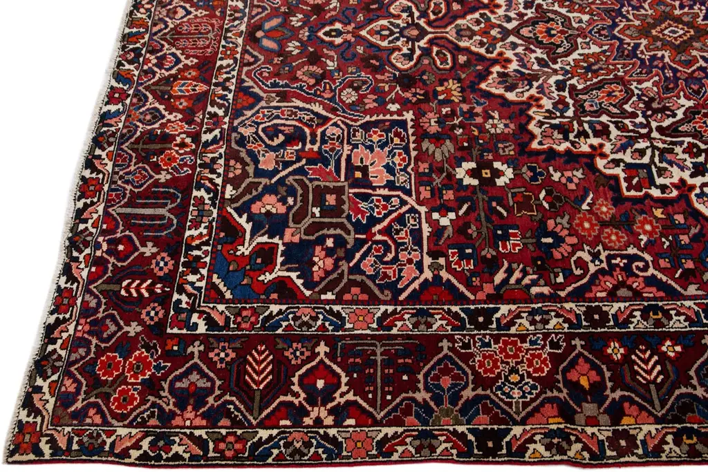 Beautiful antique Bakhtiari hand-knotted wool rug with a red field. This Persian piece has an all-over multicolor accent in a gorgeous classic Medallion motif.This rug measures 9'11" x 12'.
