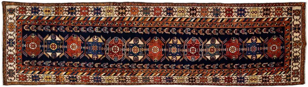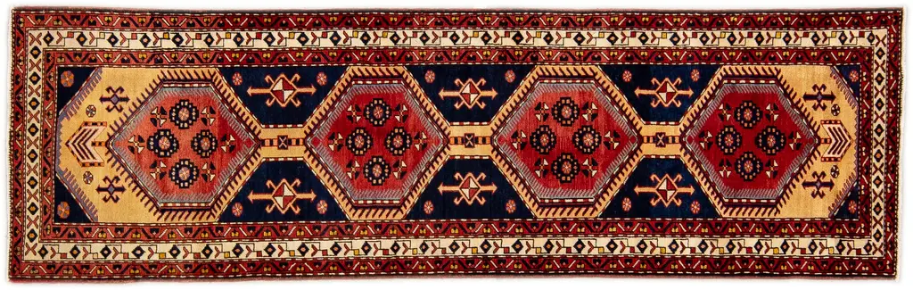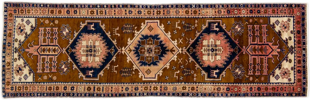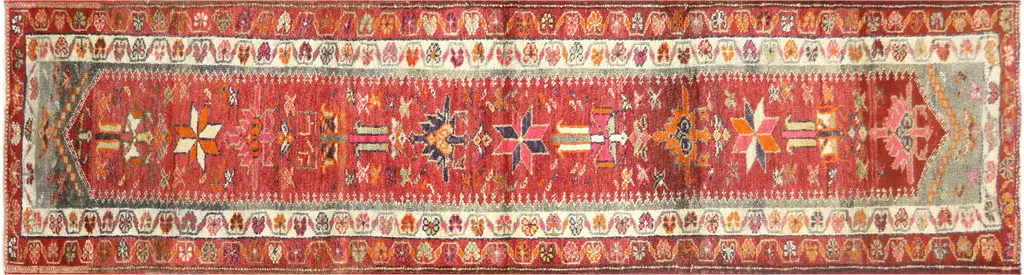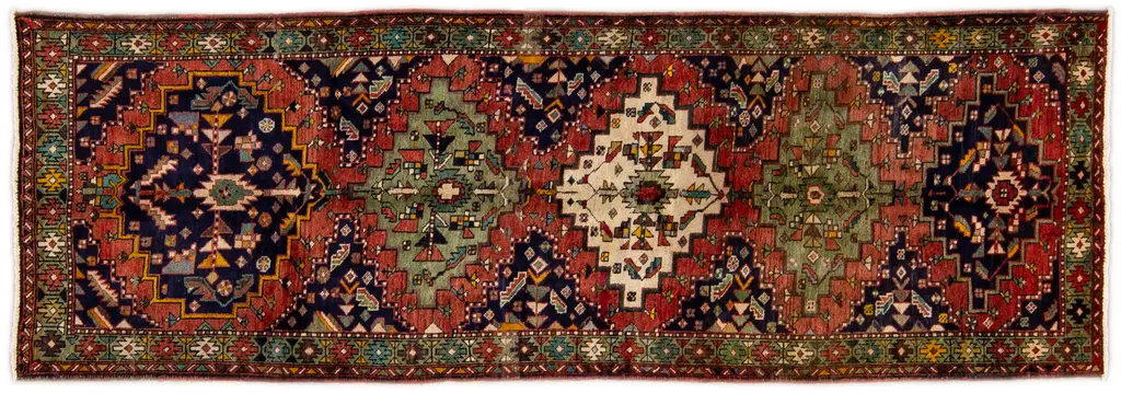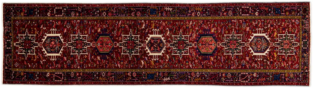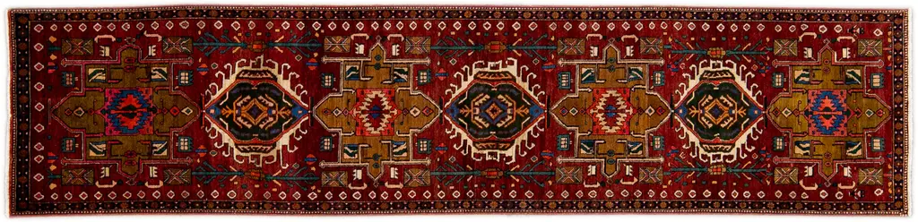 Beautiful Antique Heriz Handmade Wool rug with an all-over red field. This piece has multicolor accents in a gorgeous all-over geometric medallion design. This rug measures: 3'5" x 14'9".