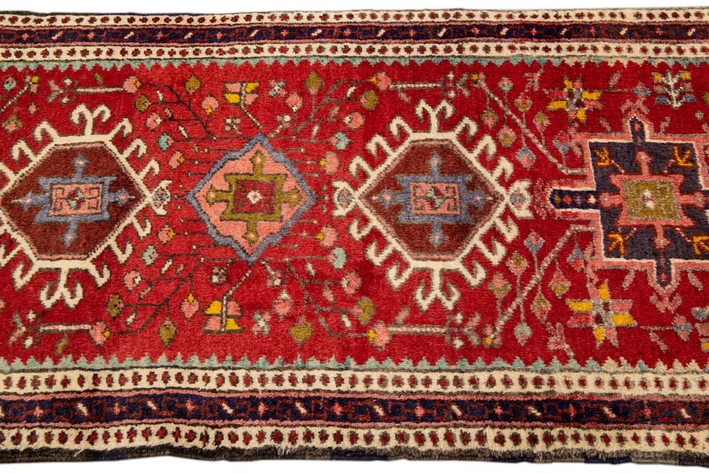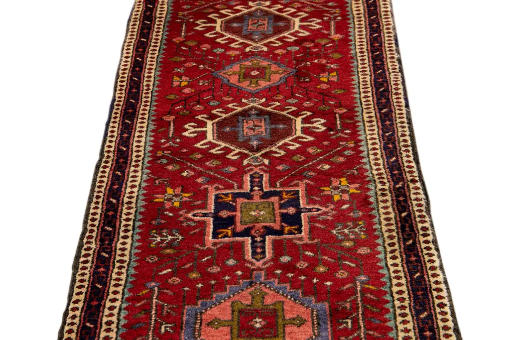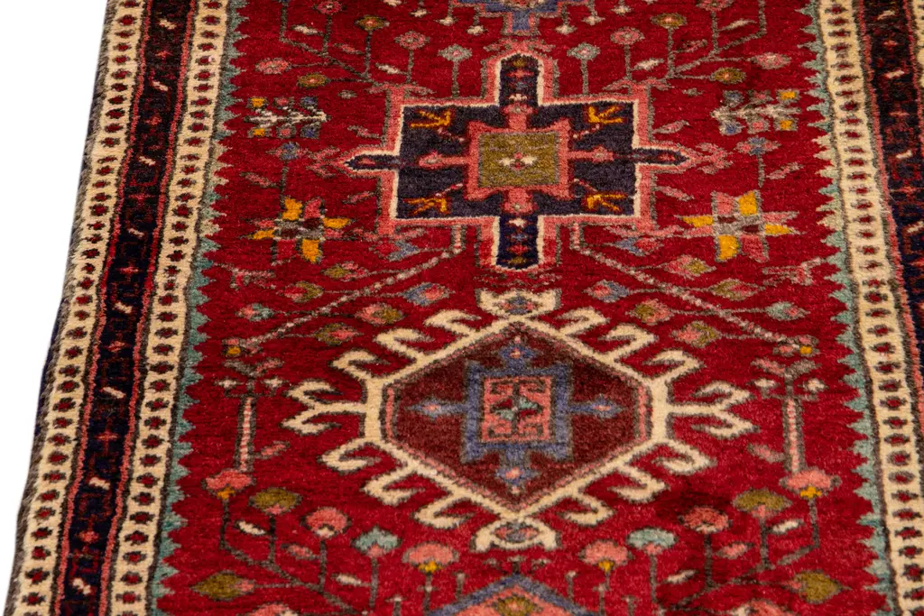 Beautiful Antique Heriz Handmade Wool rug with a red field. This piece has multicolor accents in a gorgeous all-over geometric medallion design. This rug measures: 2'3" x 10'10"