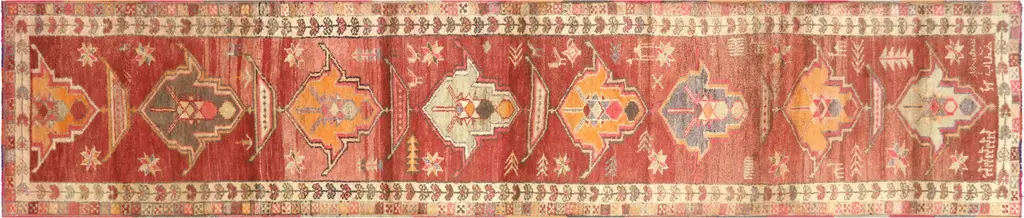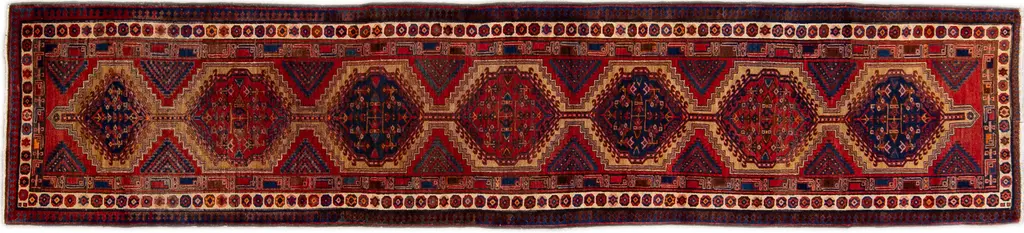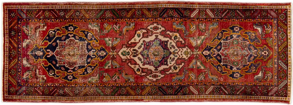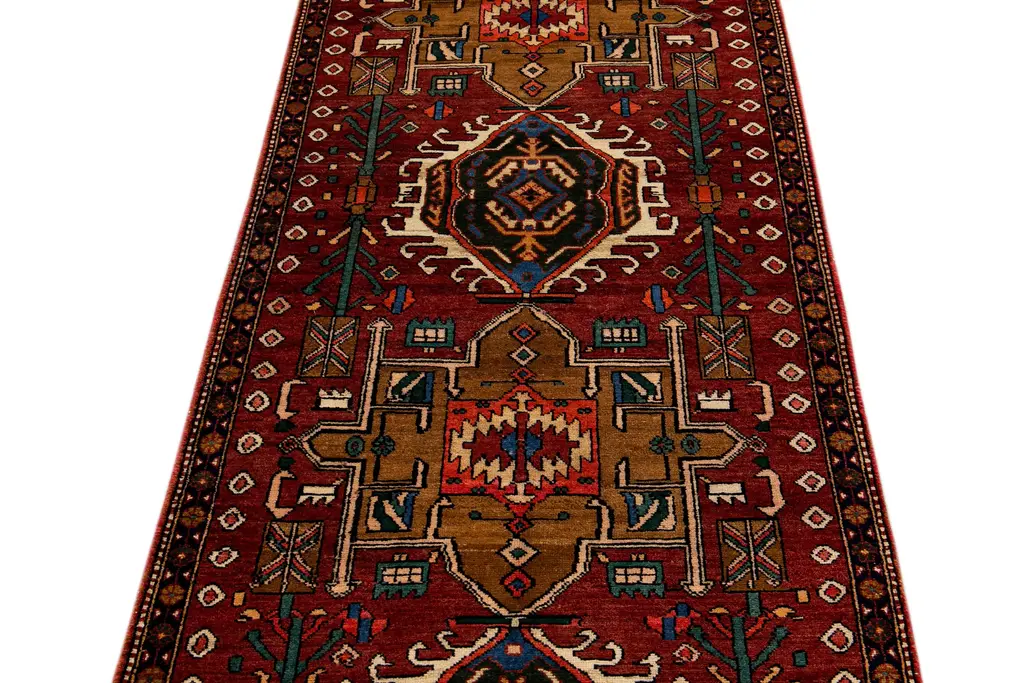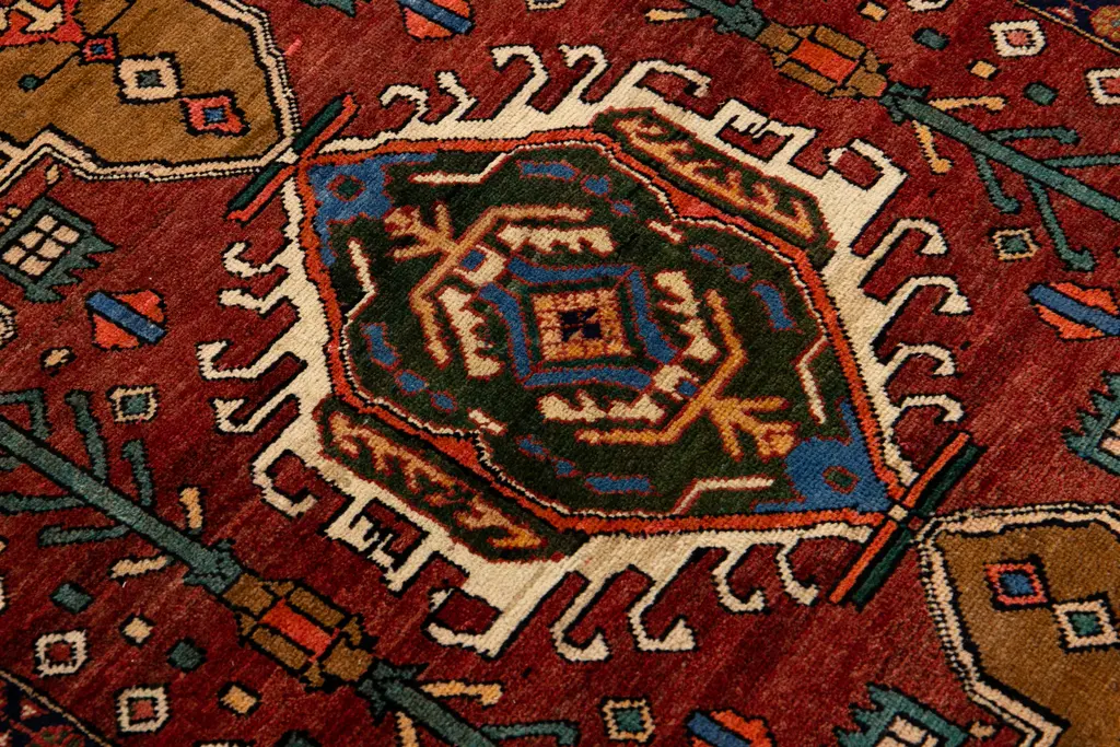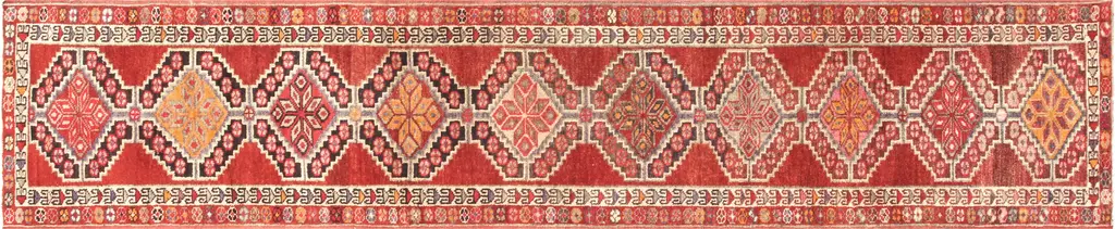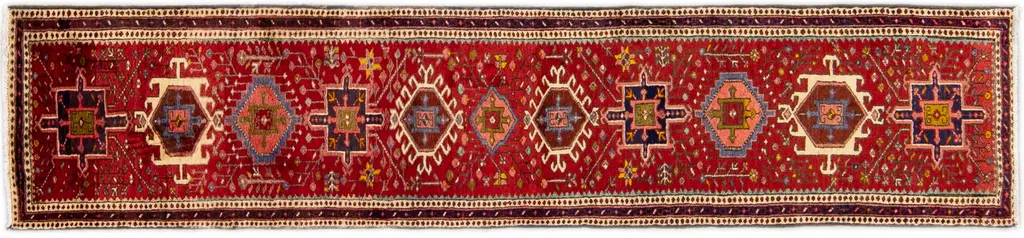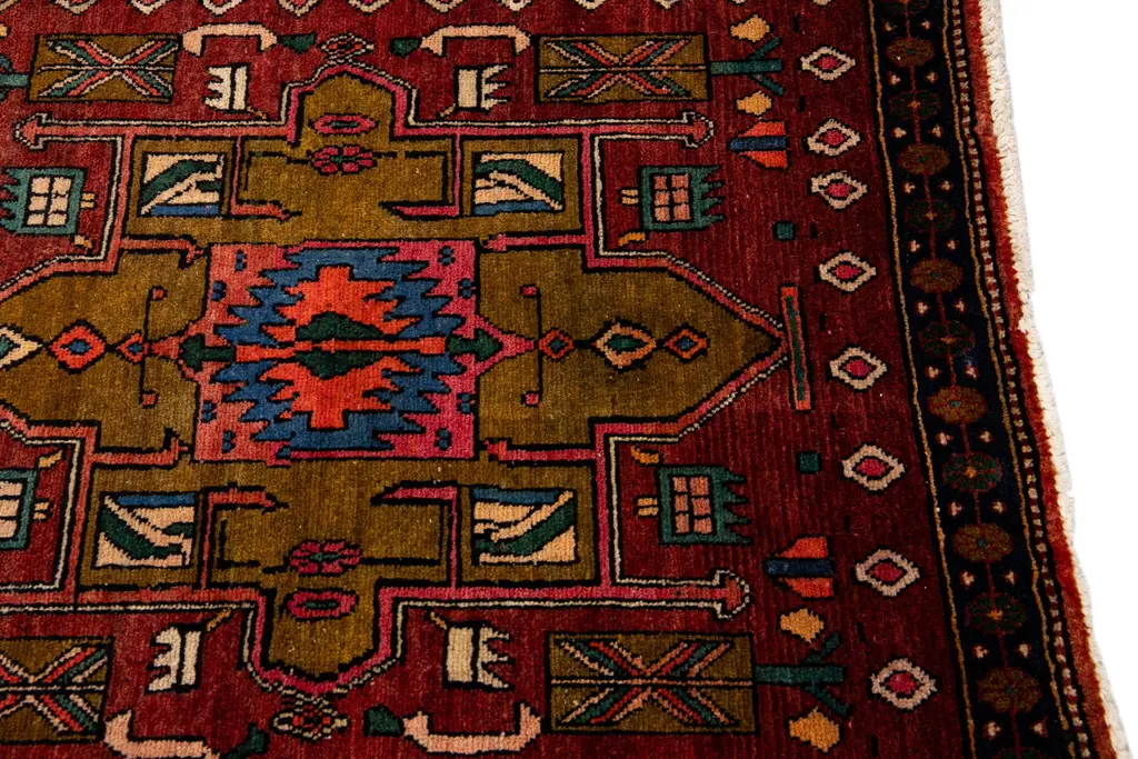 Beautiful Antique Heriz Handmade Wool rug with an all-over red field. This piece has multicolor accents in a gorgeous all-over geometric medallion design. This rug measures: 2'10" x 12'7".