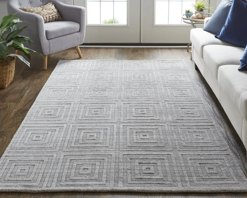 Collection: Redford Colors: Gray, Silver Gray Construction: Hand Woven Material: Face: Viscose, Wool Pile: Low Pile Pile Height: 0.12" Styles: Transitional,Casual,Farmhouse Backing: N/A Made In: India Thickness: 0.12" Price Range: $$$$$ (Premium)