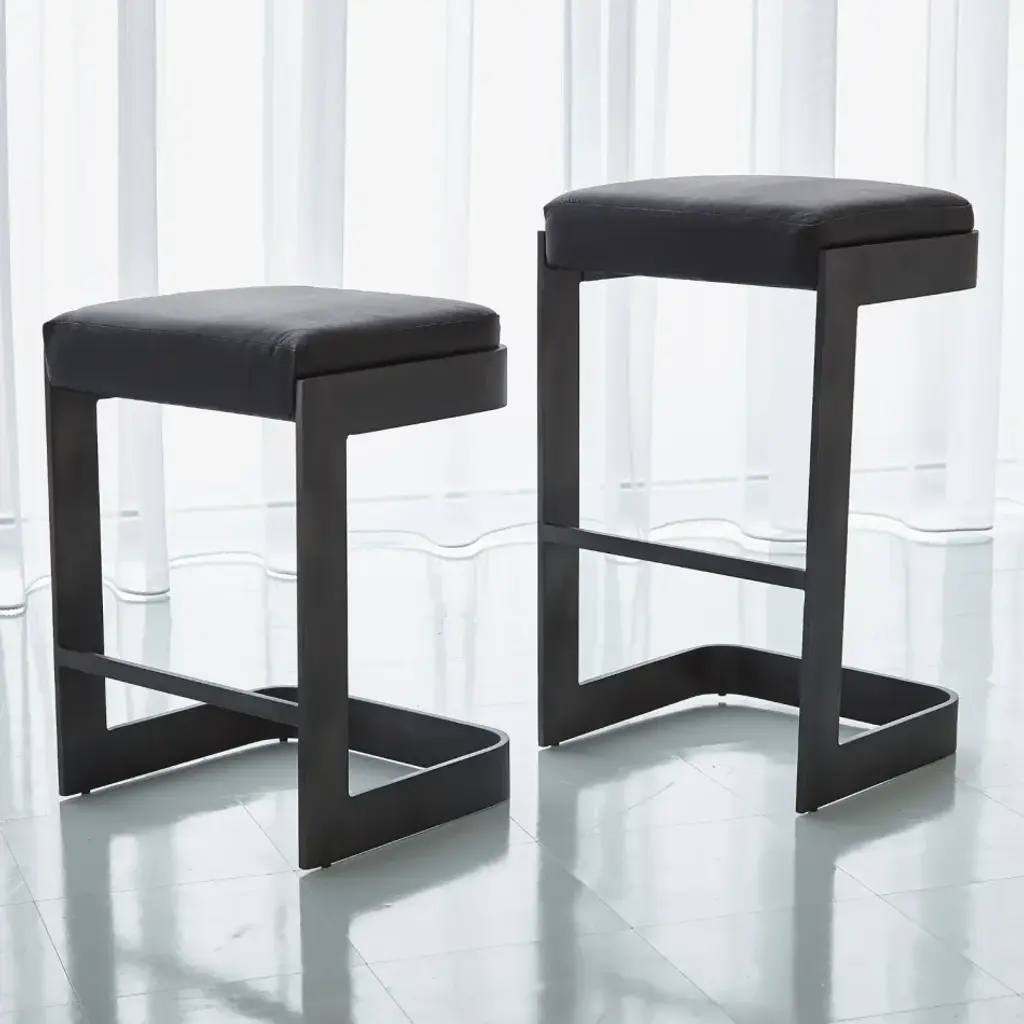 Attractive and useful contemporary barstools are made from sturdy graphite-finished mild steel and cushioned black leather seats. Available in bar or counter heights. From a fashion forward perspective, Global Views offers accessories, furniture, statement lighting, and an assortment of rugs and mirrors to add beauty and joy to your home.