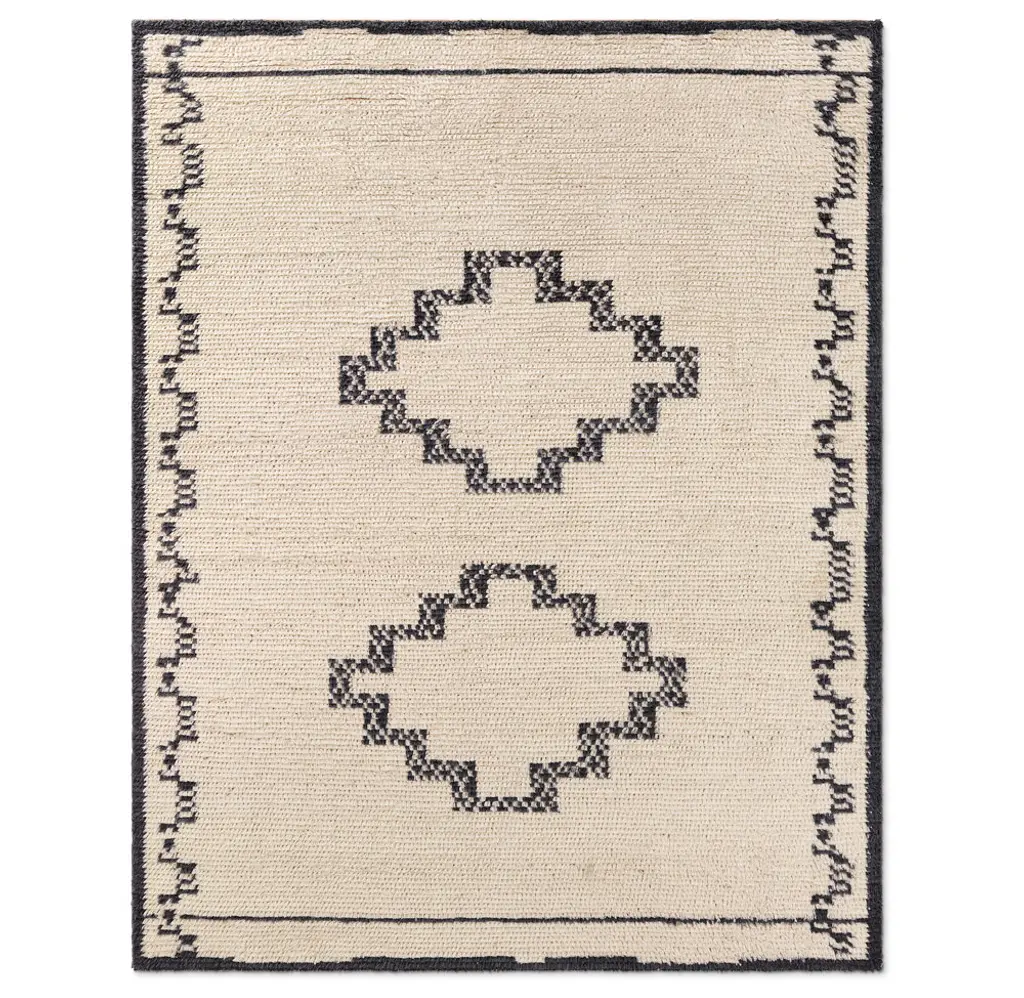 Rehana's dynamic borders and geometric motifs trace their lineage to vintage North African rugs. Hand-sheared pile creates a textural finish that echoes the imperfect character of the originals.