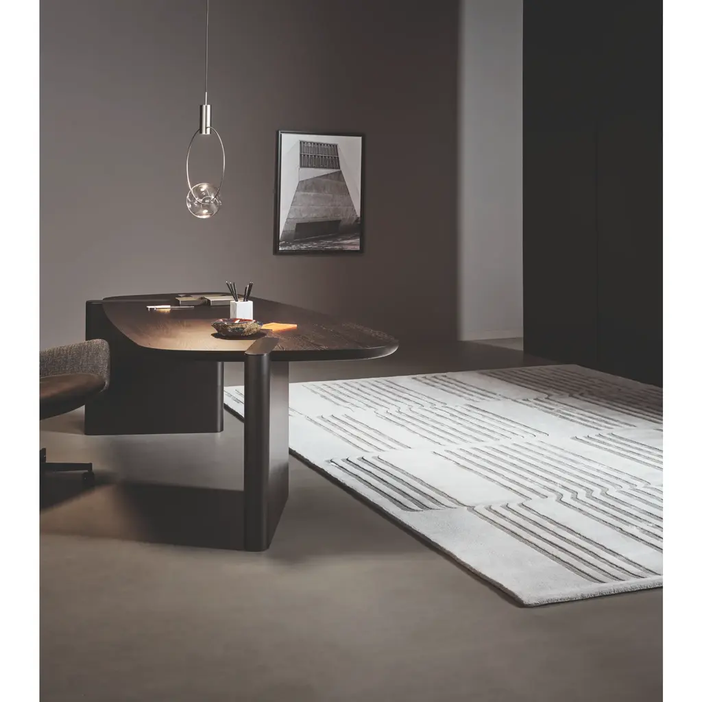 The Rabat rug is inspired by abstractionist artistic currents, in which geometry and variable compositions are the distinctive features. The rug combines different finishes, shades and shapes that emphasize its rigour and aesthetic research. An almost interrupted central profile, made of darker Tencel, vertically divides the carpet into two non-identical parts. Furthermore, the combination of different materials such as wool and Tencel underline a dynamism that contrasts with the geometric rigour of its shape, creating levels that are staggered but still in perfect harmony with each other. The Rabat rug furnishes any living and dining space in a welcoming style but can also be used in the sleeping area.